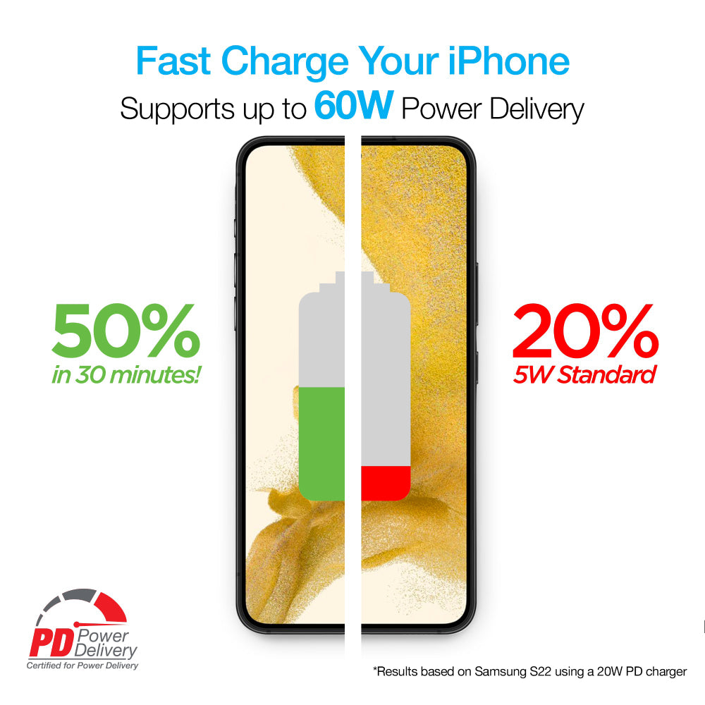 Este cable, que admite hasta 60 W de carga rápida Lightning y Power Delivery, puede cargar por completo y sin problemas su iPhone, iPad o iPod, o su Mac y iPad Pro con Thunderbolt 3 (USB-C) más rápido que nunca.