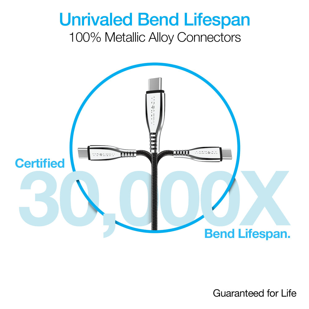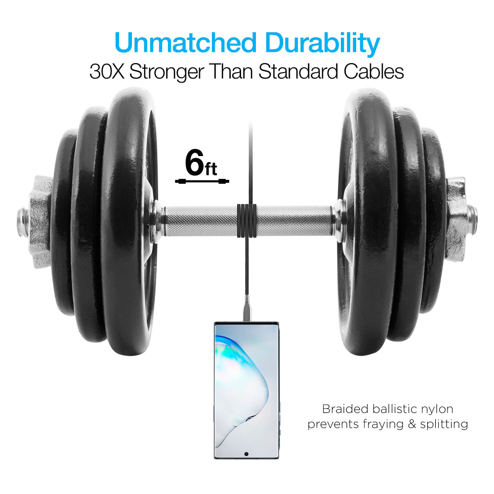 Fabricado con la resistencia del titanio. No se deshilacha, no se parte ni se debilitan las puntas de los conectores. El cable de titanio resiste el uso diario activo con nailon trenzado balístico indestructible y está reforzado con conectores de aleación metálica para una durabilidad inigualable y un rendimiento increíble a alta velocidad.