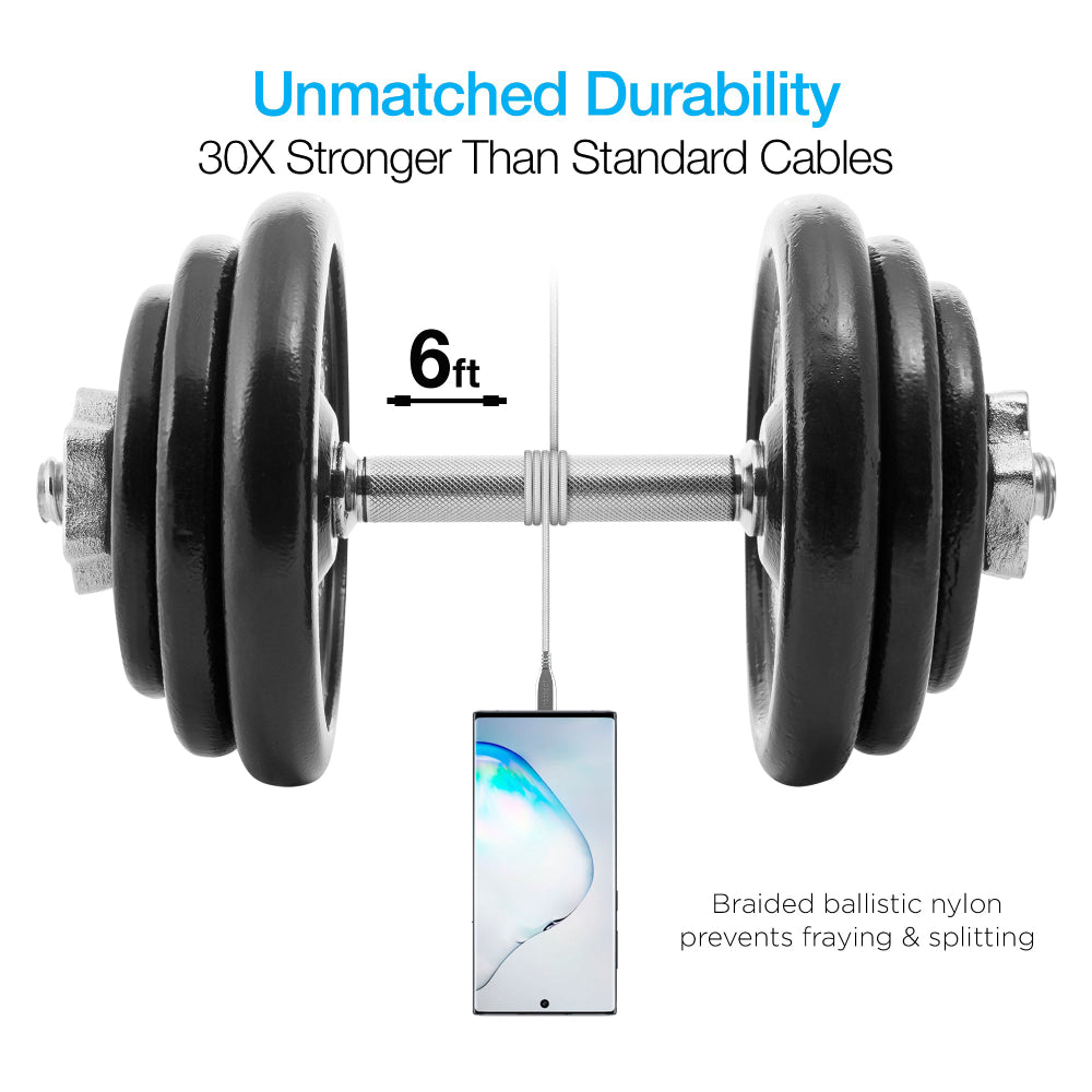 Fabricado con la resistencia del titanio. No se deshilacha, no se parte ni se debilitan las puntas de los conectores. El cable de titanio resiste el uso diario activo con nailon trenzado balístico indestructible y está reforzado con conectores de aleación metálica para una durabilidad inigualable y un rendimiento increíble a alta velocidad.