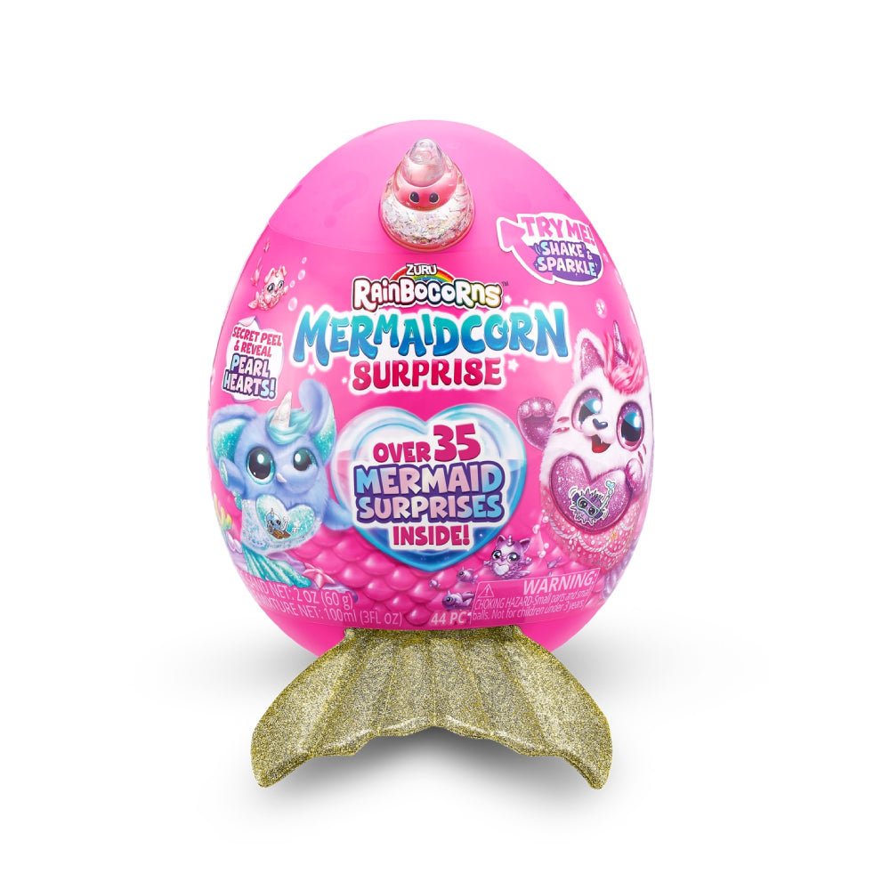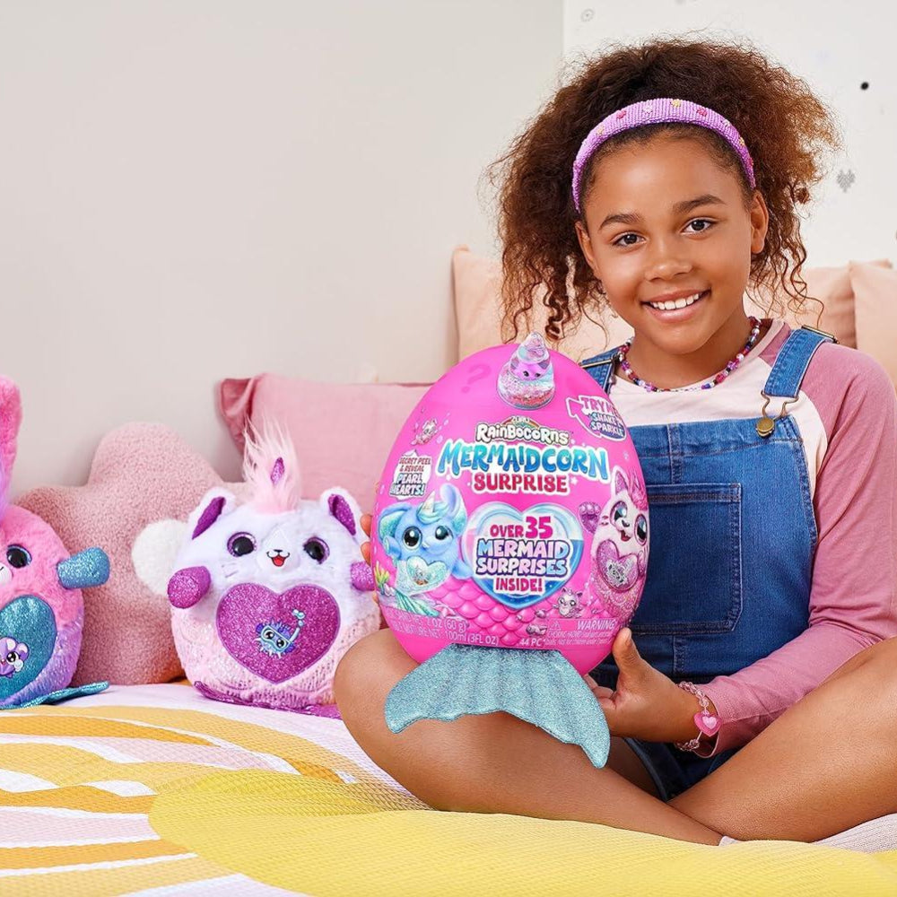 ¡Estos Mermaidcorns están listos para causar sensación en Rainboville! ¡Abre el huevo para desempacar a tu nuevo amigo con aletas y más de 35 sorpresas! ¡Estos adorables peluches vienen con una brillante cola de sirena y un Boo-Boocorn escondido dentro de su cuerno de globo de agua! ¡Hay 6 Mermaidcorns para coleccionar, cada uno con un corazón que se despega y revela para decirte lo que ama tu Mermaidcorn! ¡Explora Mermaid Cove y encuentra a tu nuevo mejor amigo tierno!