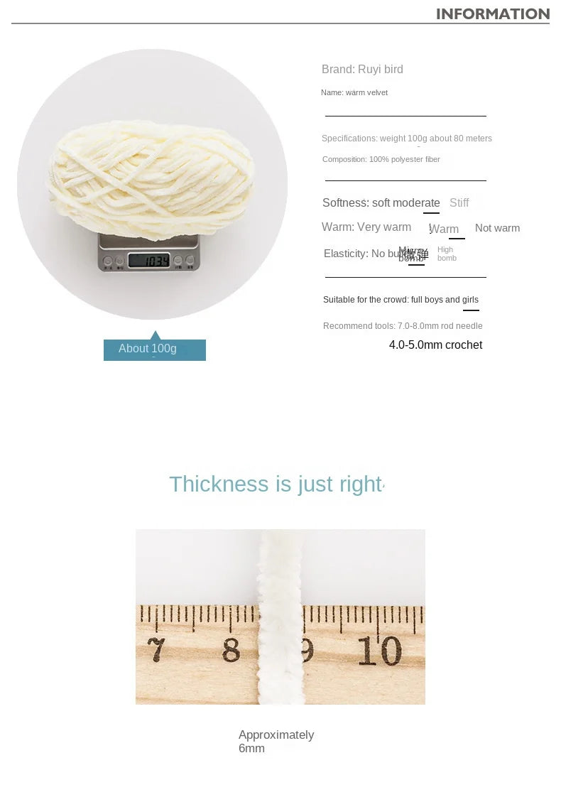 Introducing the Ruyi Bird Warm Fleece Thick Wool Crochet Golden Velvet Yarn, your ultimate companion for all knitting and crafting projects. Made from 100% high-quality polyester, this yarn offers a unique blend of warmth and softness, perfect for creating cozy garments, plush toys, and beautiful home decor. With a vibrant array of colors and a generous length of 80 meters per roll, you can explore your creativity without limits. Ideal for both beginners and experienced crafters, this yarn promises to enhance your crafting experience with its easy-to-work texture and durability. Whether you're knitting colorful scarves, crafting plush pillows, or designing delightful toys, the Ruyi Bird Warm Fleece Yarn is designed to meet all your needs while adding a touch of elegance to your creations.