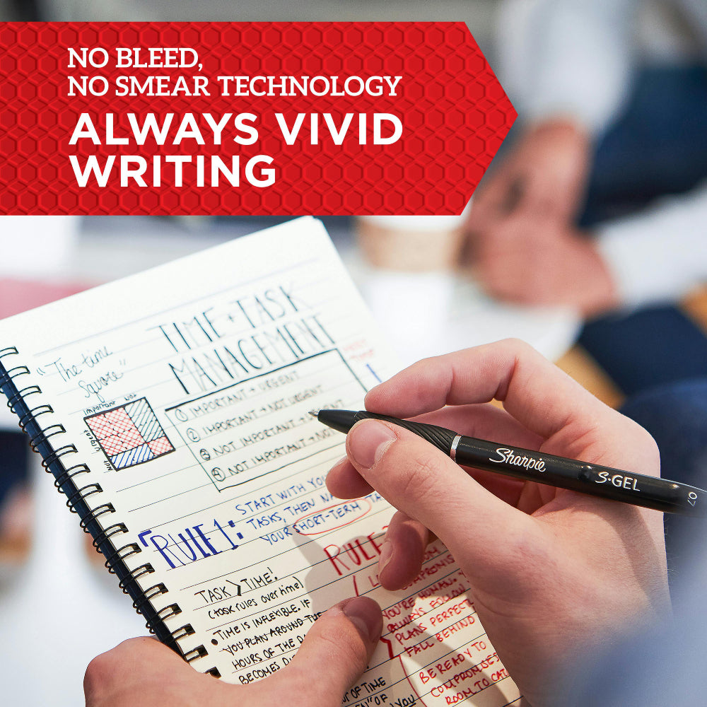 El poder de Sharpie ahora está en un bolígrafo de gel con Sharpie S-Gel. Con tecnología que no mancha, no se corre y tinta de primera calidad, este bolígrafo Sharpie ofrece una escritura siempre vívida. Es un bolígrafo de gel de alto rendimiento con un aspecto elegante y profesional que lo convierte en un instrumento de escritura que no querrás prestar. Y el agarre de goma contorneado hace que escribir sea cómodo durante cualquier tarea. Disponible en varios tamaños de punta, acabados de cuerpo y colores de tinta de gel, Sharpie S-Gel ofrece una experiencia de escritura suave perfecta para hogares, escuelas u oficinas.
