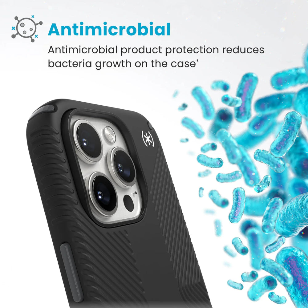Introducing the Speck Persidio2 Grip Case for Apple iPhone 16 Pro - Black/Slate Gray, an expertly crafted protective case designed to enhance your smartphone experience. Featuring an innovative soft-touch finish and unique no-slip inverted grips with tactile side ridges, this case not only looks great but offers unparalleled comfort and ease of use. With the ability to withstand drops of up to 13 feet, you can confidently engage in everyday activities"”texting, calling, or taking photos"”without fear of damaging your device. Trust the Presidio2 Armor Cloud Technology to keep your phone safe during life's unexpected moments. Experience the perfect blend of style, functionality, and robust protection with the Speck Persidio2 Grip Case, ensuring your iPhone 16 Pro remains in pristine condition. Product Highlights. Innovative no-slip inverted grips with tactile side ridges for a secure hold Soft-touch finish enhances both aesthetics and scratch-resistance Compatible with all Apple MagSafe accessories for added convenience Up to 13-foot drop protection using advanced Presidio2 Armor Cloud Technology Antimicrobial product protection to reduce bacteria growth and maintain cleanliness