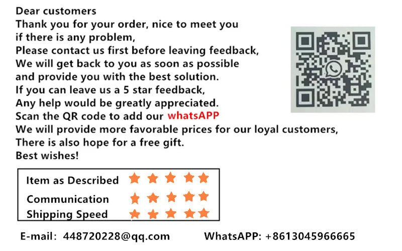 Le agradeceríamos mucho que nos dejara una valoración de 5 estrellas. Escanee el código QR para agregar nuestro WhatsApp y ofreceremos precios más favorables a nuestros clientes leales, incluso un obsequio gratis.