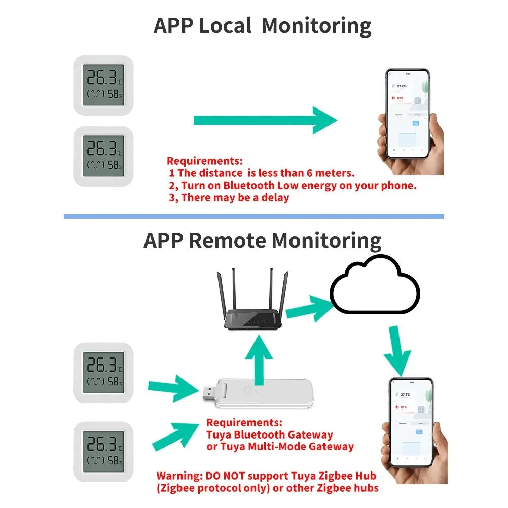 Si desea monitorear de forma remota la temperatura y la humedad, debe configurar el sensor en Tuya Bluetooth Gateway o Tuya Multi-Mode Gateway. Si se utiliza la configuración Bluetooth del teléfono móvil, el sensor no tiene función de monitoreo remoto o vinculación. Si el teléfono móvil está conectado directamente, algunos teléfonos Android necesitan activar la función GPS (Bluetooth de bajo consumo está incluido en la función GPS)