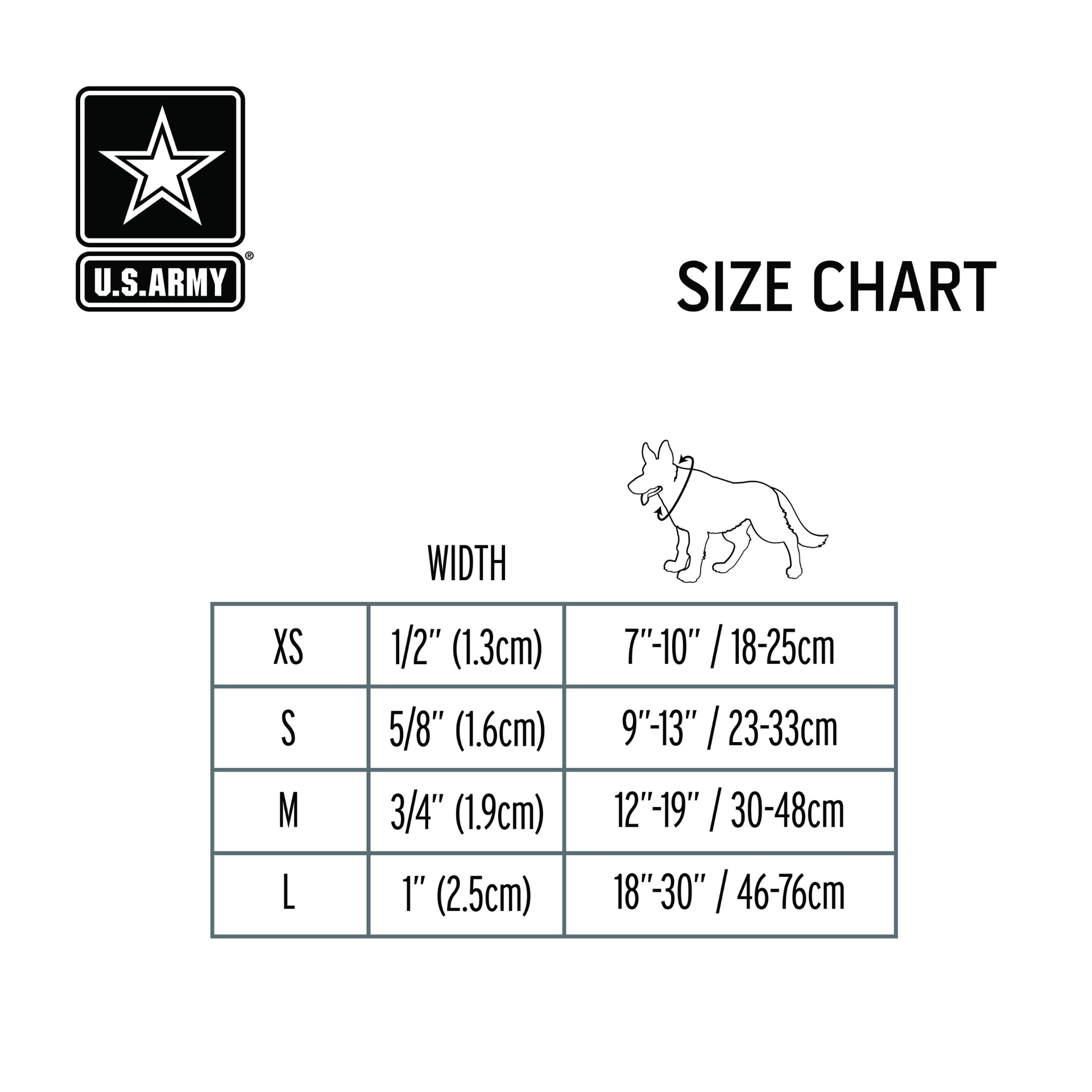 Walk in style with this official licensed US Army® Dog Collar. Reflective and rugged, all sizes of dogs can show their support for our troops and look great too! Make a matching set with our US Army® Dog Leash. Dark camo (solid army green) with black and yellow strip and US Army polydrop logo.
