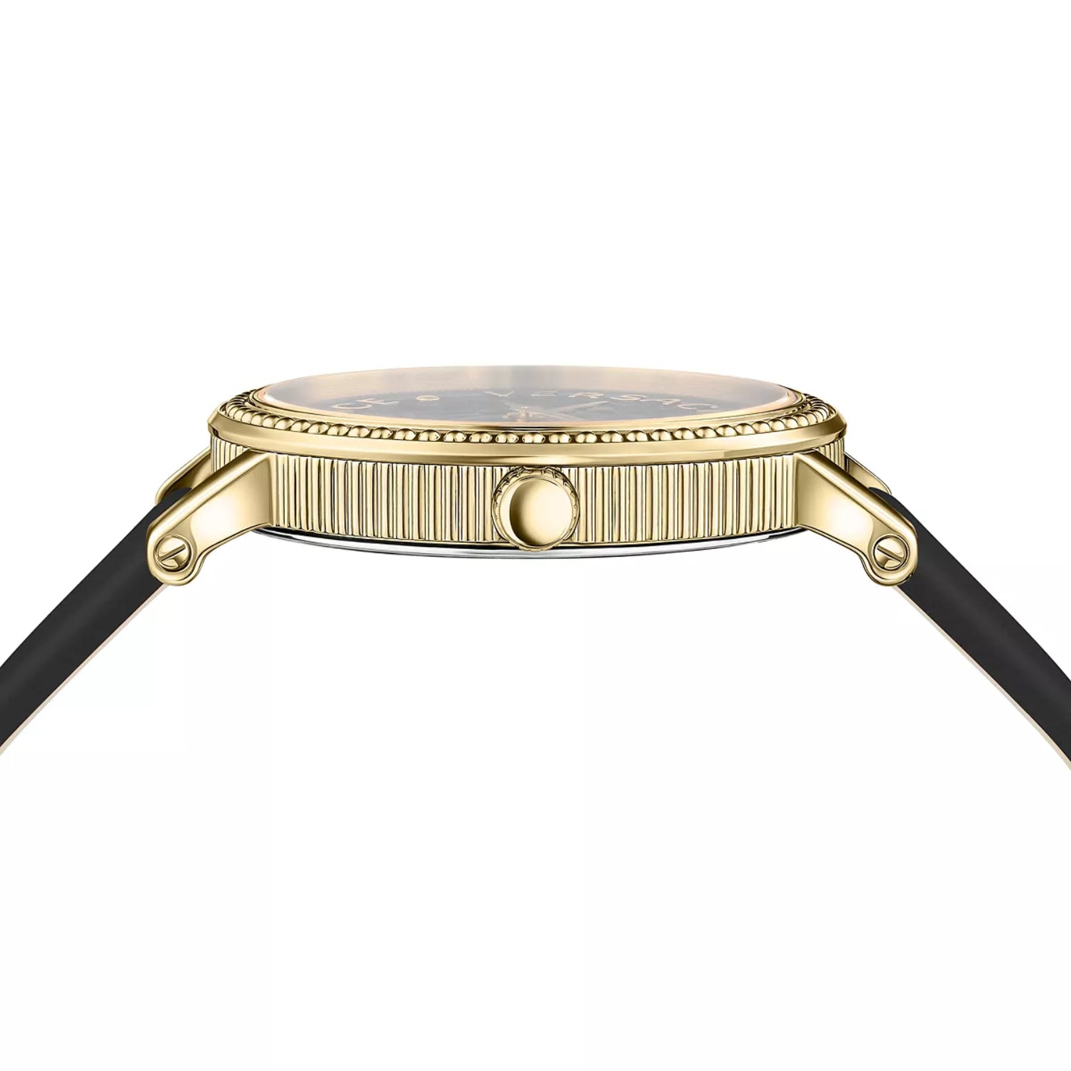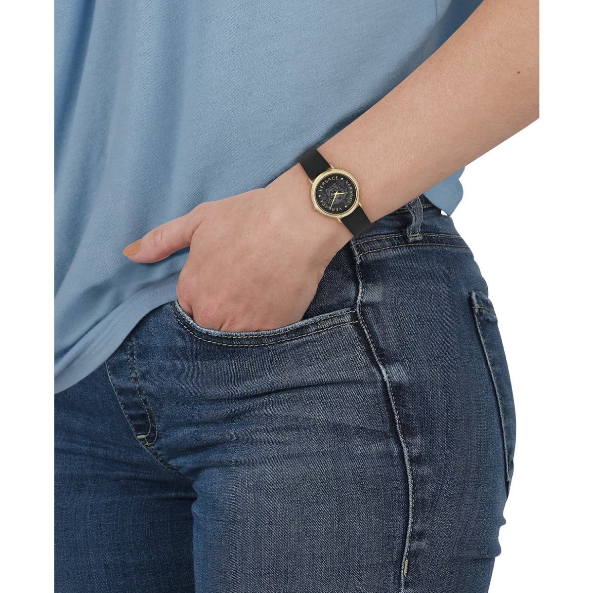 Realza tu estilo con el reloj Versace V-Dollar para mujer de 37 mm con correa suiza en un elegante color negro. Este exquisito reloj combina a la perfección la elegancia italiana con la precisión suiza. El icónico motivo V-Dollar en la correa y la cabeza de Medusa en la esfera irradian sofisticación.