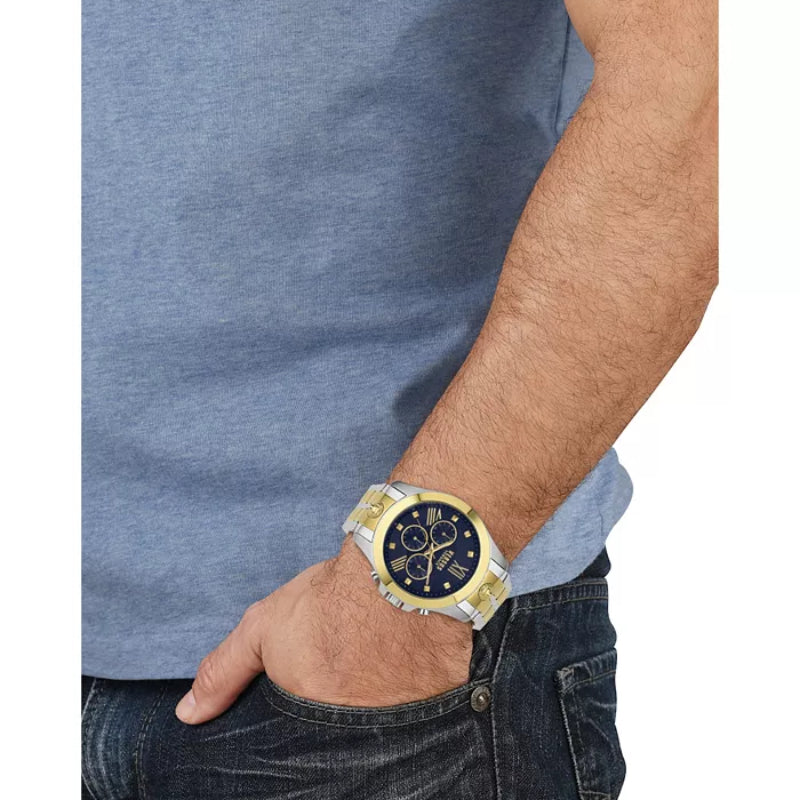 The Versus Versace Chrono Lion Men's 44 mm Two-Tone Bracelet Watch - Blue Dial is the epitome of sophistication, expertly blending classic design elements with modern flair. With its striking blue dial accented by the iconic lion head emblem, this watch is designed for the cool, confident man who embraces tradition while looking toward the future. The unique two-tone bracelet adds a touch of elegance, making it perfect for any occasion, from casual to formal. Its bold size and intricate detailing ensure that it stands out as a statement piece, reflecting your unique style and personality.