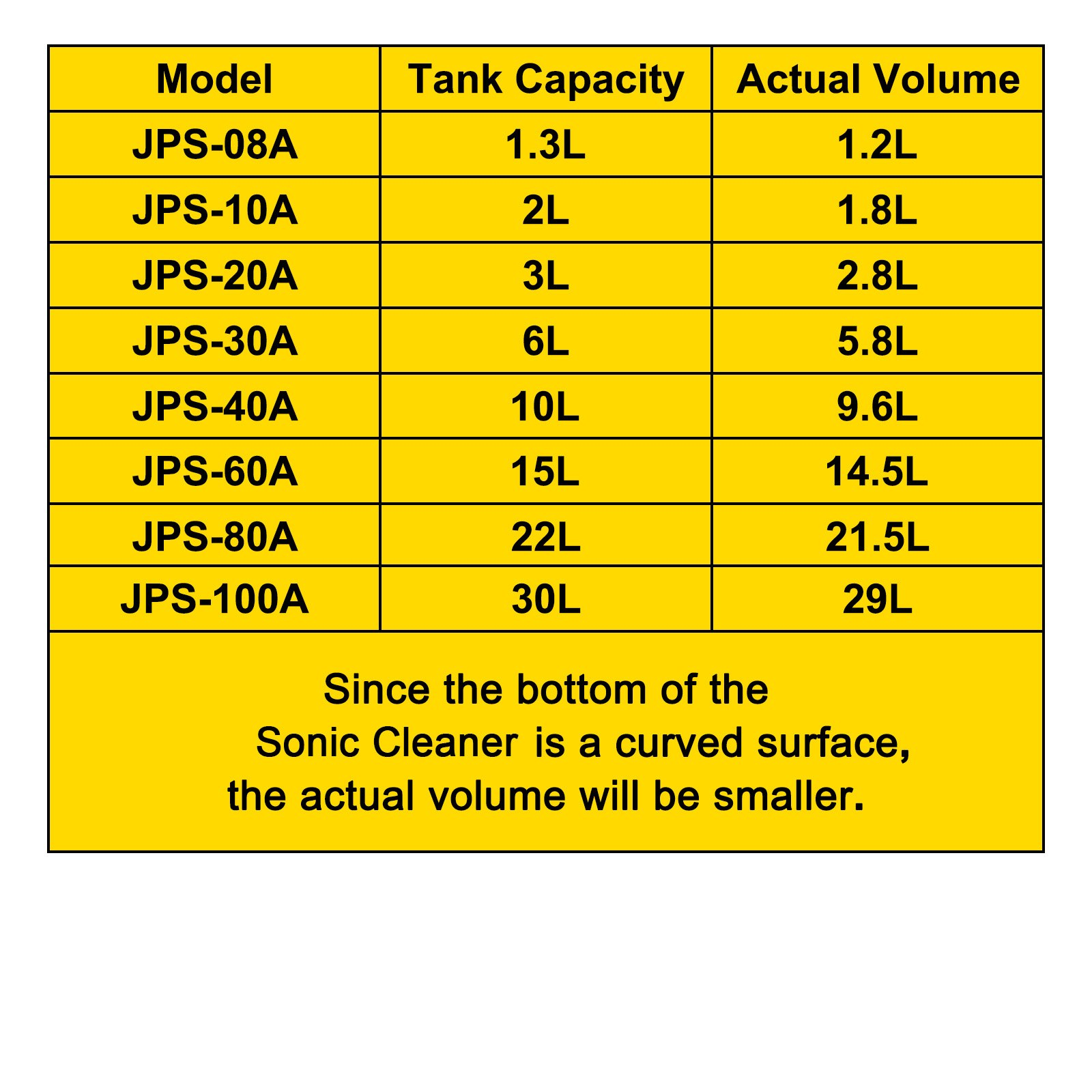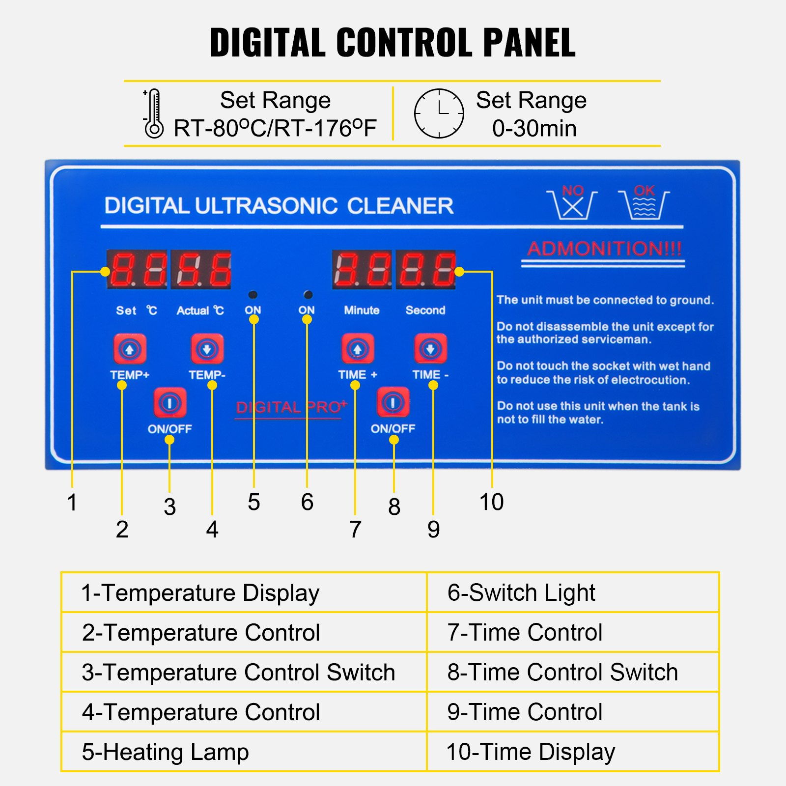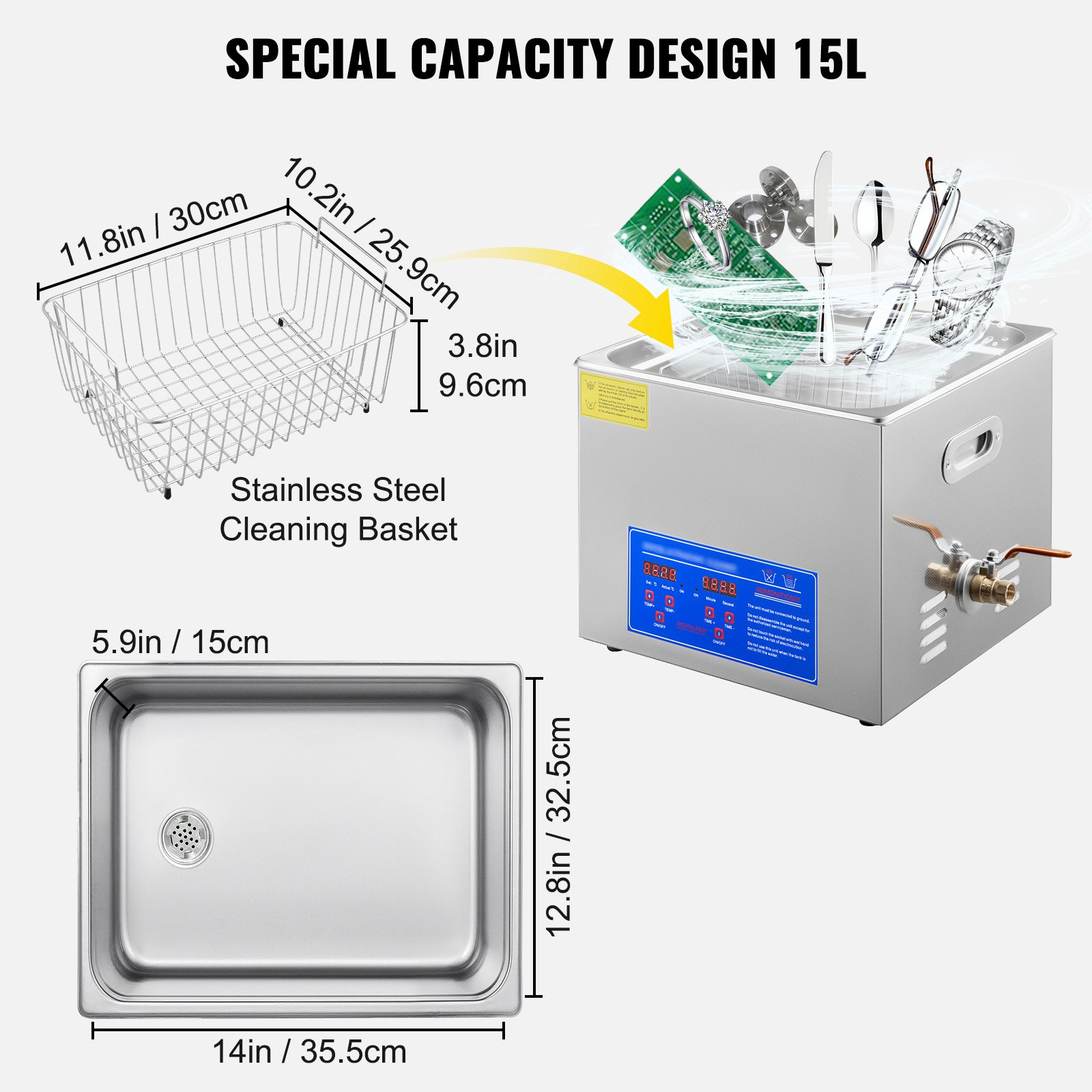 Time Setting: 0 - 30 minutes (LED Digital Display),Transducer Quantity: 6 sets,Tank Size (L x W x H): 14" x 12.8" x 5.9" / 35.5 x 32.5 x 15 cm,Package Size(L x W x H): 17.8" x 16.3" x 13.8" / 45 x 41.5 x 35 cm,Power Supply: AC110V/60Hz,Temperature Setting: RT-176℉/RT-80℃,Tank Capacity: 13.5-15L (Since the bottom of the ultrasonic cleaner is a curved surface, the actual volume will be smaller.),Product Size (L x W x H): 14" x 13" x 11.2" / 35.5 x 33 x 28.5 cm,Product Weight: 9.72kg/21.4lbs,Frequency: 40kHz,Ultrasonic Power: 360W,Tank Material: Stainless Steel SUS304,Heating Power: 400W