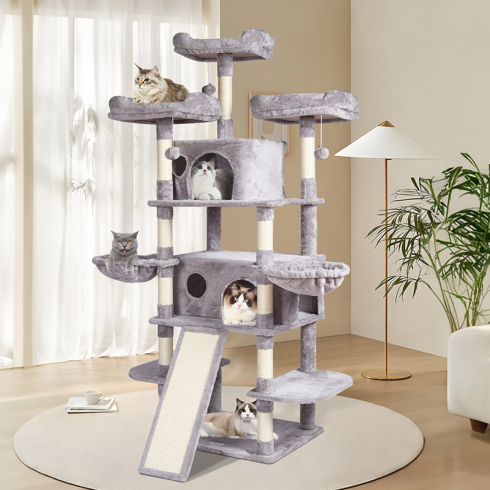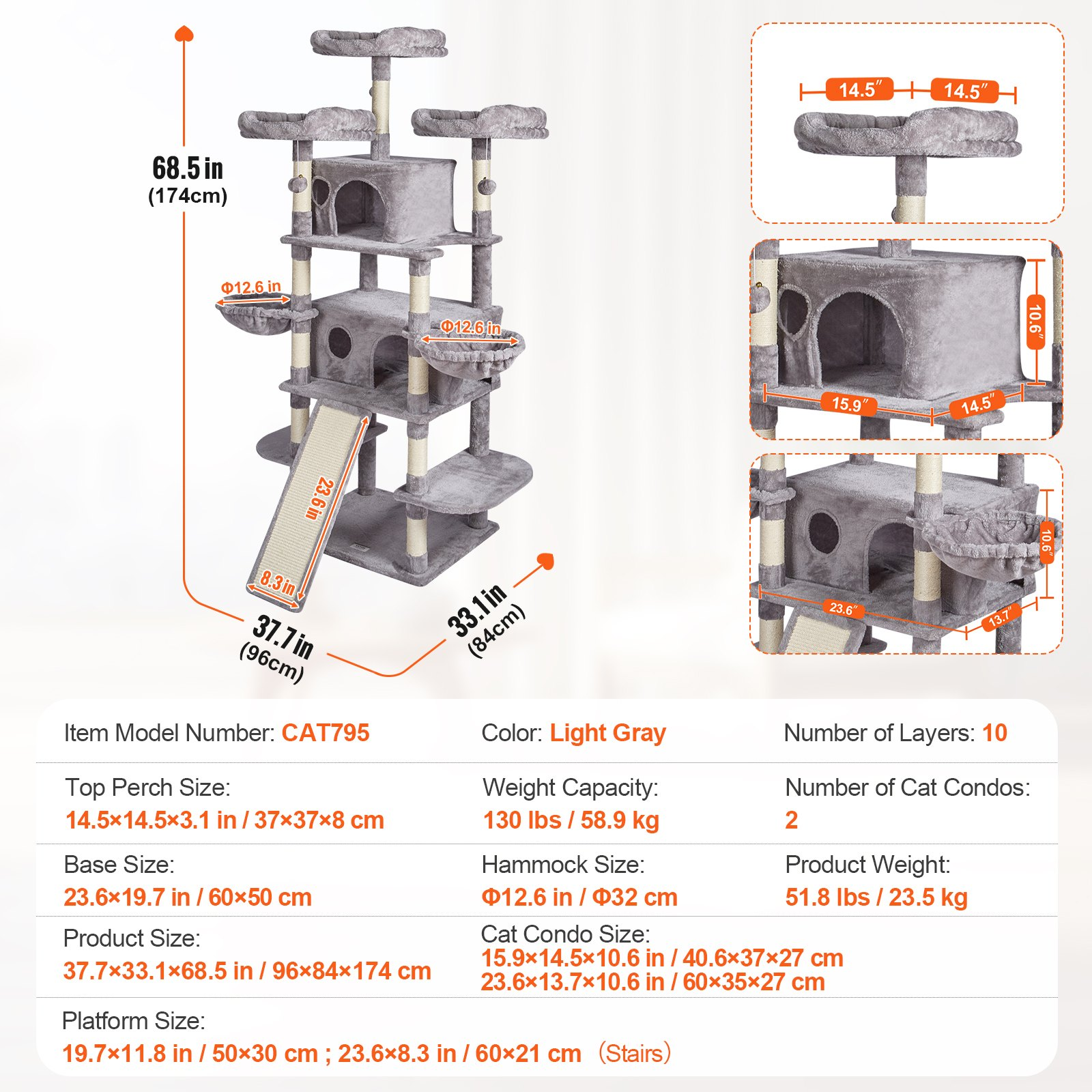 Cat Condo Size: 15.9"×14.5"×10.6"/40.6×37×27 cm;23.6"×13.7"×10.6"/60×35×27cm,Hammock Size: Φ12.6"/Φ32cm,Top Perch Size: 14.5"×14.5"×3.1 "/37×37×8 cm,Number of Layers: 10,Number of Cat Condos: 2,Weight Capacity: 130 lbs/58.9 kg,Base Size: 23.6"×19.7"/60×50cm,Color: Light Grey,Item Model Number: CAT796,Product Weight: 51.8 lbs/23.5 kg,Product Size: 37.7"×33.1"×68.5"/96×84×174 cm
