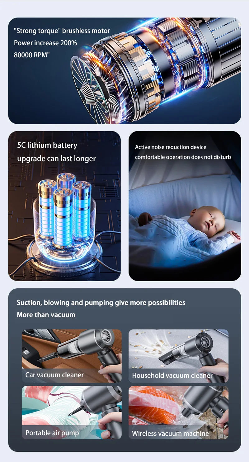 Equipped with a new upgraded brushless motor, this vacuum operates quietly (≤ 52db), so you can clean without disturbing others. The innovative smart chip comes with a child lock feature, ensuring safety while in use. Whether you need to tackle crumbs from snacks or dirt from outdoor adventures, this vacuum cleaner offers the versatility you need with its multiple operating modes. Experience the convenience of powerful, portable cleaning!