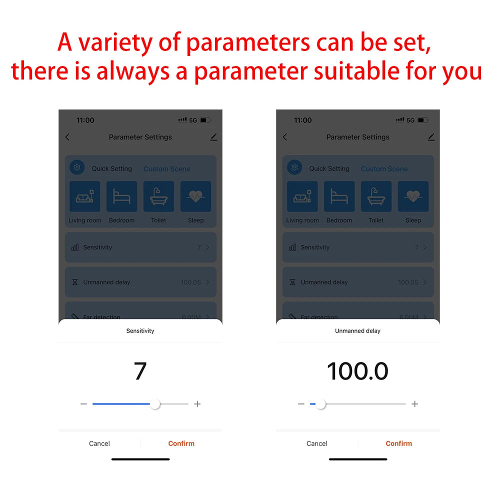 Configure la sensibilidad de 1 a 9 según sus propias necesidades, junto con un rango de detección mínimo de 0,00 m y un máximo de 9,5 m para una demanda de detección flexible. Mientras tanto, está diseñado con un tiempo de retención establecido de 0 a 1500 s y una latencia de detección establecida de 0 a 10 s para evitar movimientos molestos irrelevantes y reducir la tasa de falsas alarmas.