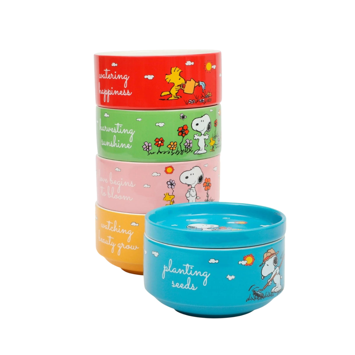- Set of 6 stackable bowls featuring Snoopy’s garden-themed story art
