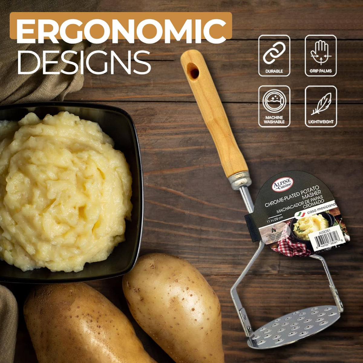 This heavy-duty potato masher is crafted from durable stainless steel and features a wide mashing plate with a sturdy bamboo wood handle for effortless use. Its ergonomic, non-slip wooden grip keeps hands safely away from heat while ensuring maximum control. Ideal for mashing potatoes, guacamole, applesauce, and more, this multi-purpose tool provides fluffy, smooth textures every time. Easy to use and clean, itβs an essential kitchen companion built for performance and comfort.
