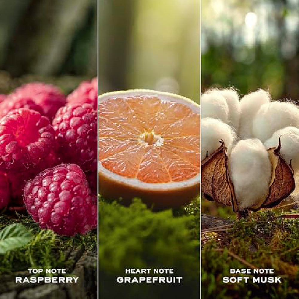 - Bright fruity-floral scent with raspberry, grapefruit, violet, and rose notes.