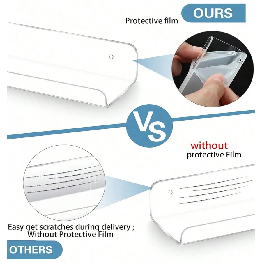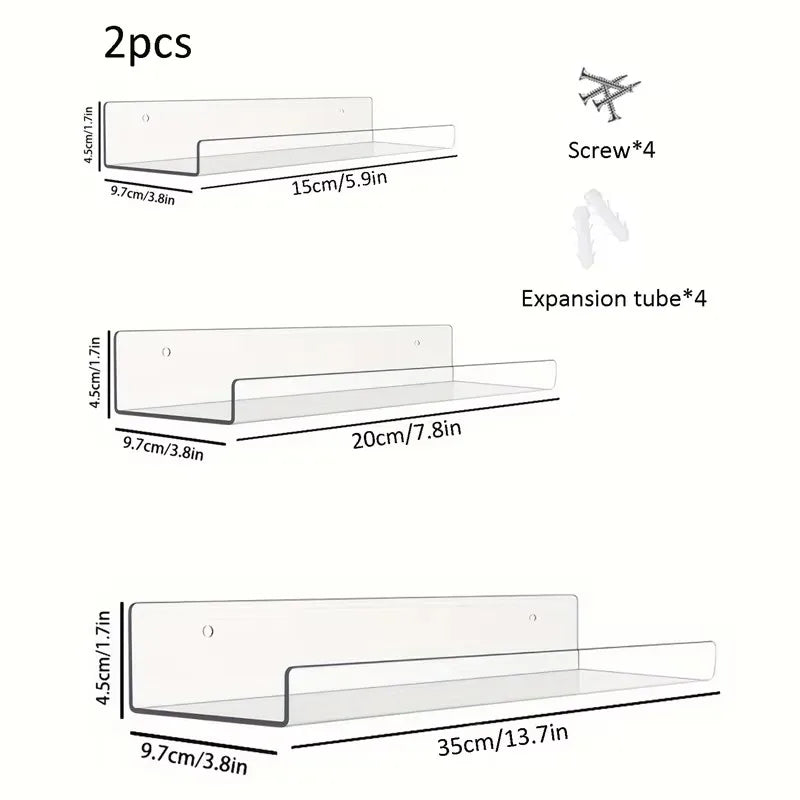 Transform your space with the 2pc Clear Acrylic Storage Rack Wall Mounted Book Floating Shelf Makeup Display Stand Holder Bathroom Kitchen Organizer. This innovative and stylish storage solution not only helps you declutter your living areas but also adds a contemporary touch to your decor. Made from high-quality, eco-friendly acrylic, these floating shelves are perfect for showcasing your favorite books, cosmetics, and kitchen essentials while maximizing vertical space. With a clear design, they seamlessly blend into any room, making them ideal for living rooms, bathrooms, or kitchens.