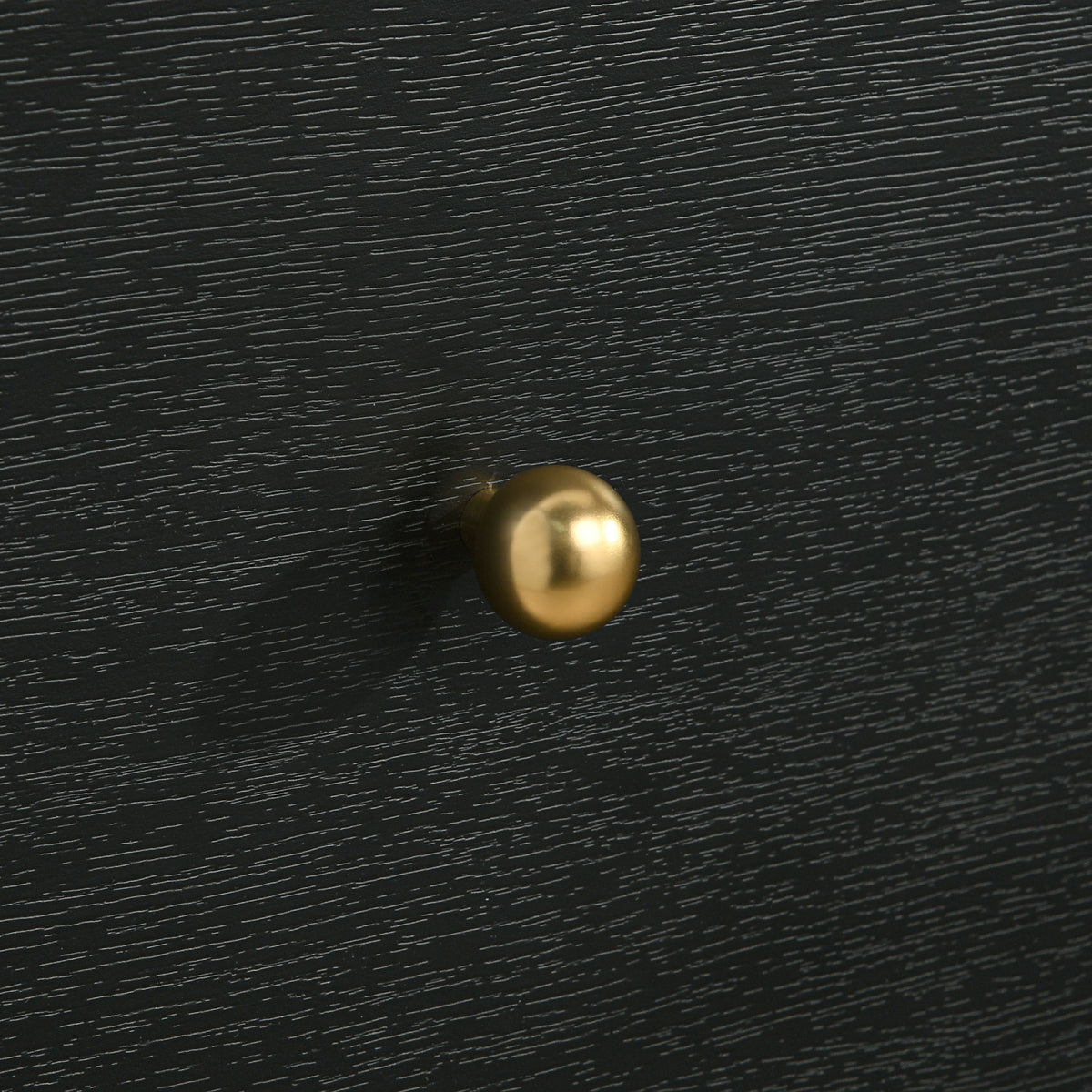Complement a stylish bedroom with the abundant storage featured in a modern six-drawer dresser. Delivering a sophisticated presentation, it boasts a black finish over melamine surfaces that resist damage to remain looking their best. Ball knobs complement each drawer front, standing out with a rich, warm brass finish. The case of the dresser features rounded corners, softening the overall presentation of the dresser. A wide top is ideal for jewelry boxes and decor that lends a personalized touch.