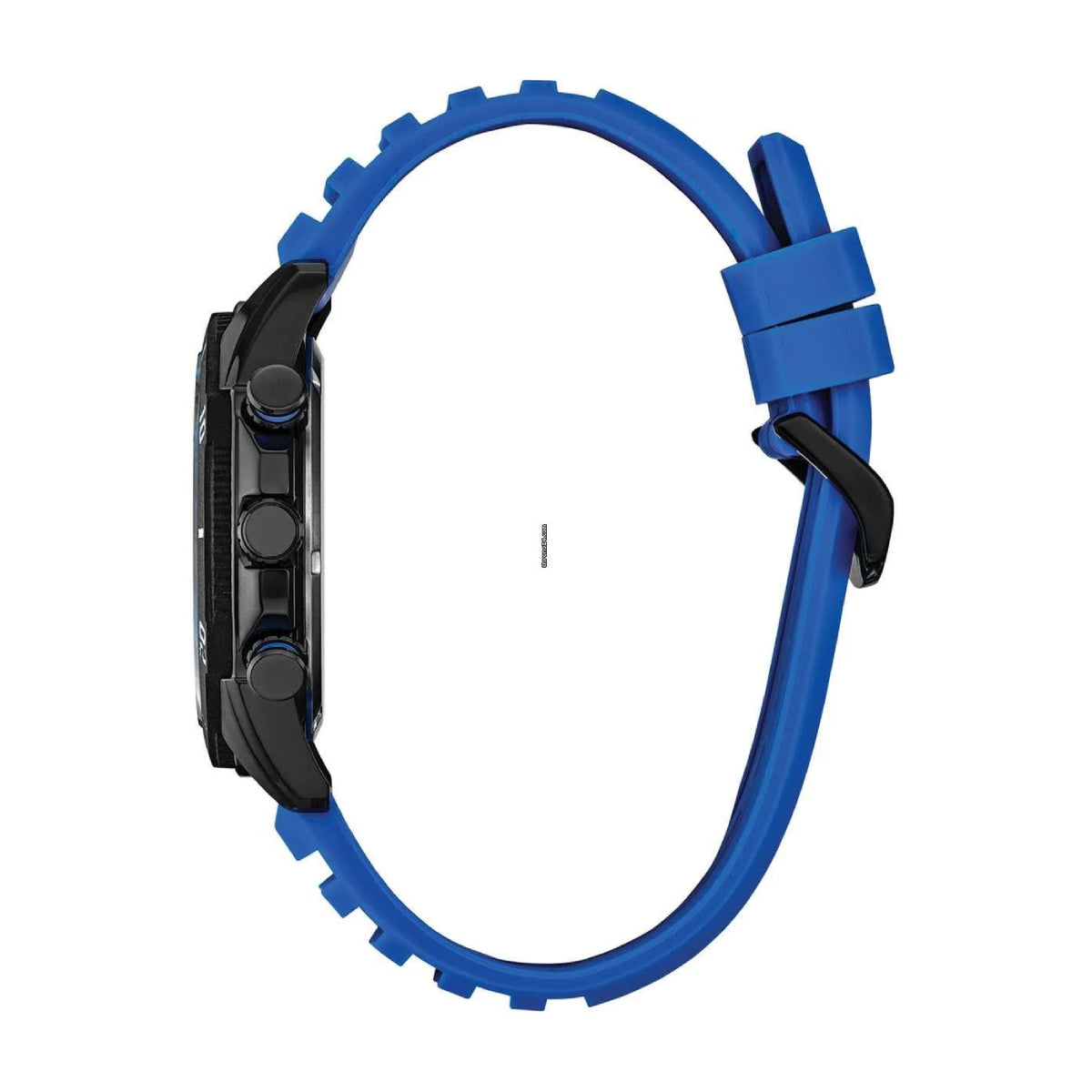 The Citizen Eco-Drive Brycen is a bold and sporty chronograph designed for adventure. Featuring a 45mm black ion-plated stainless-steel case, it boasts racing-style pushers with blue accents and a rotating 60-minute bezel for added functionality. The black dial has luminous hour markers and a blue tachymeter scale, ensuring high visibility in any light condition. Powered by Eco-Drive technology, this watch never needs a battery, using light as its energy source. A durable blue silicone strap ensures a comfortable and secure fit. With 1-second chronograph timing up to 60 minutes, 12/24-hour time format, and a date display, this 100m water-resistant timepiece is perfect for sports, travel, and daily wear.