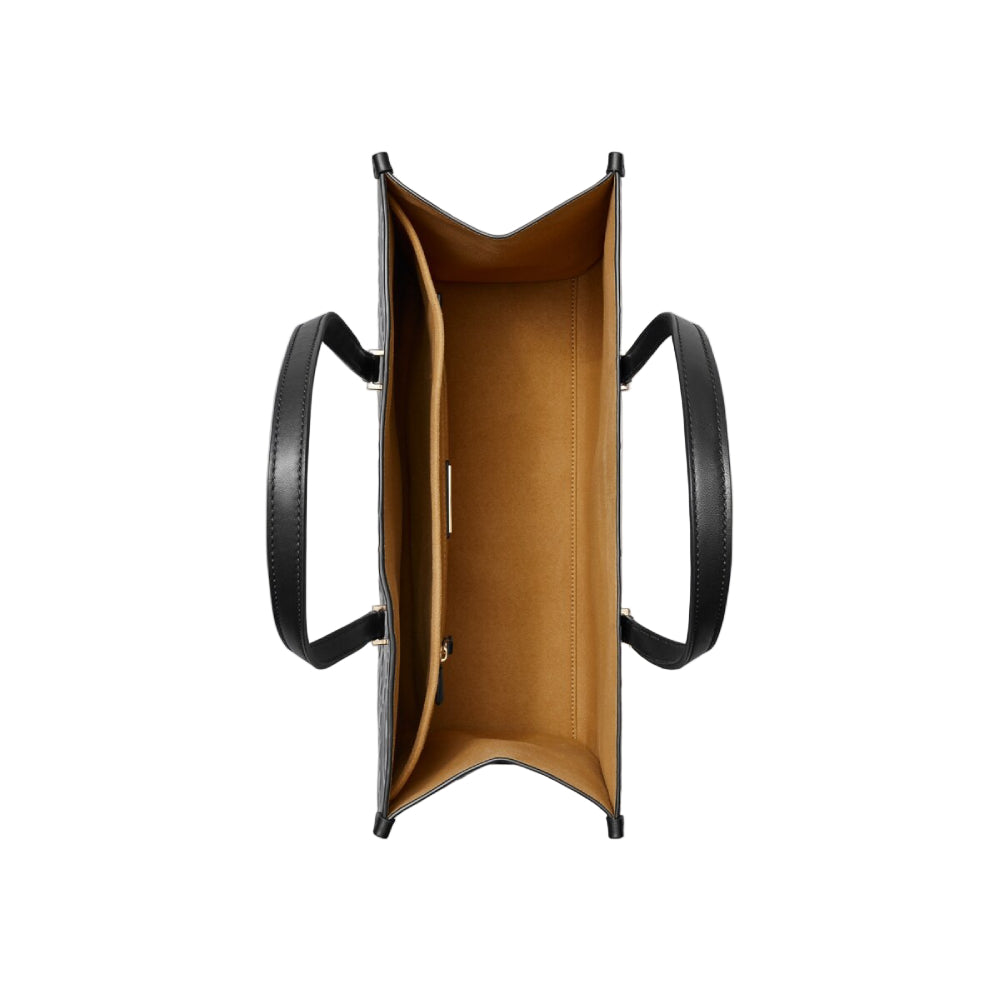 The Tory Burch Monogram Embossed Tote Bag in Black is a statement of timeless sophistication and practical design. Crafted from premium embossed leather featuring the brand’s signature T Monogram pattern, this tote combines luxury craftsmanship with everyday functionality. Lined with soft microsuede, it includes an interior laptop sleeve and multiple pockets for organized storage. The structured silhouette, elegant top handles, and subtle tonal detailing make it ideal for both professional and casual occasions.