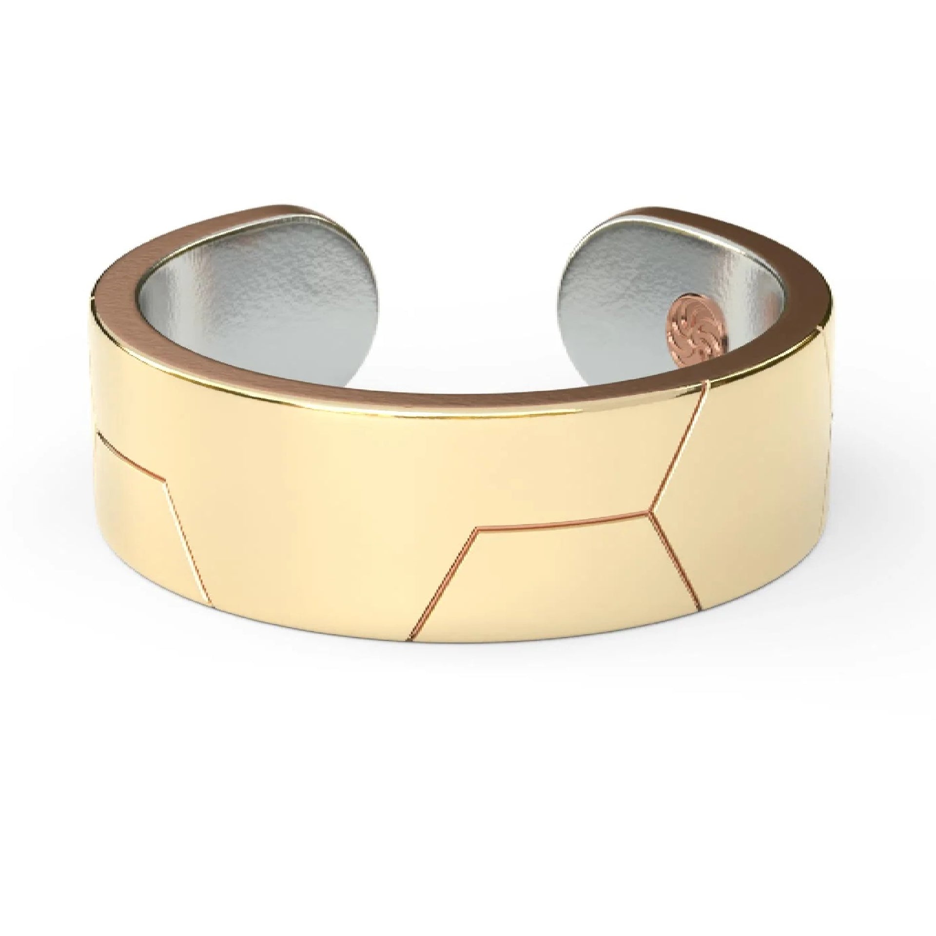 This elegant cuff ring features a Medium Bold band design with a sophisticated Trialchemy Bonded HoneyComb pattern etched into the gold-plated surface. Crafted from 14K gold plating over a substantial 925 sterling silver base, it offers a luxurious, rich honey-gold color and a smooth, polished finish. The open-ended design allows for slight adjustability and comfortable wear, revealing the contrasting sterling silver and a hint of copper bonding material on the inner surface. Its contemporary geometric pattern and mixed-metal interior give it a unique, modern alchemist aesthetic, suitable for both men and women.