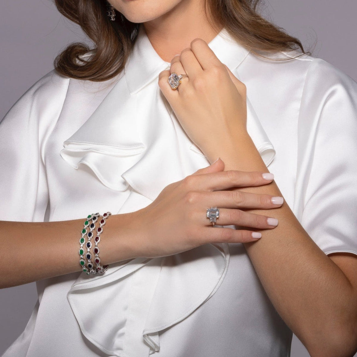 Indulge in timeless sophistication with the Anna Zuckerman Victoria 18 Women's 7.5" 8.75 ct. Diamond Crystalline and Blue Sapphire Gem Art Deco Bracelet in Platinum-Plated over 925 Sterling Silver. This stunning bracelet captures the essence of Art Deco glamour, featuring a harmonious blend of radiant oval emerald and shimmering round Diamond Crystalline stones. Crafted from durable 925 sterling silver and finished with luxurious platinum plating, it offers both brilliance and long-lasting quality. With its 7.5" length and flexible design, this bracelet ensures a comfortable fit while adding a refined touch to any outfit. Perfect for formal events or daily elegance, this piece is a statement of grace and sophistication.