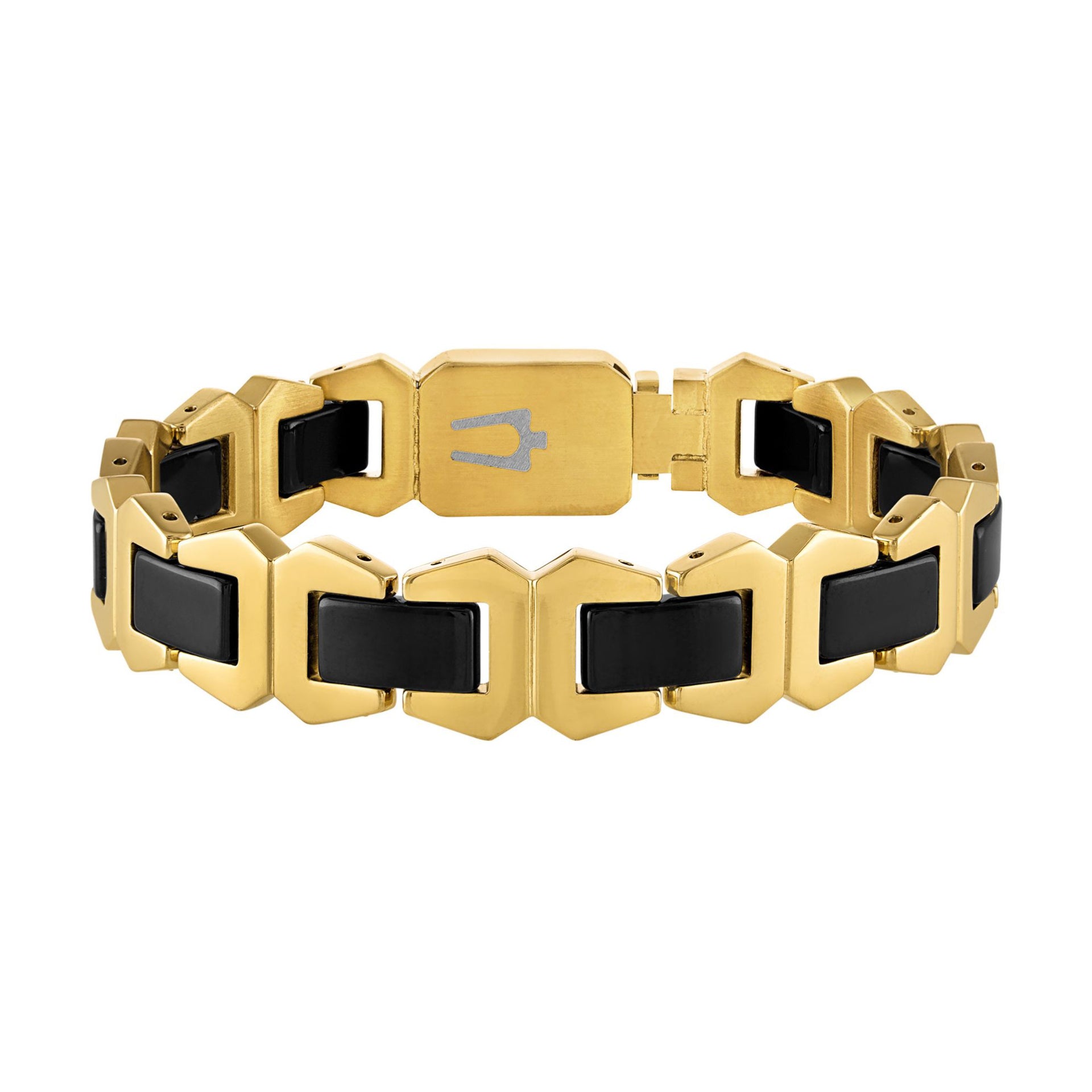 The Bulova Icon Black Ceramic and Gold-Tone Bracelet seamlessly blends traditional elegance with contemporary design, making it the perfect accessory for any occasion. Crafted from high-quality gold-tone stainless steel and luxurious black ceramic, this bracelet features Bulova's signature tuning fork-shaped links that enhance its unique aesthetic. The custom-designed clasp not only adds functionality but also showcases the iconic Bulova logo on the reverse side, ensuring that you wear a piece of history on your wrist. Measuring 8.5 inches in length, this bracelet is expertly designed for comfort and style, making it an ideal choice for both everyday wear and special occasions.