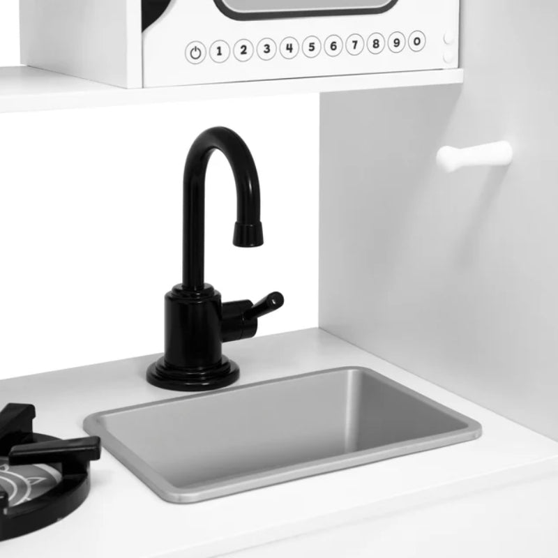 Your aspiring chef can cook up elaborate meals with the Delta Children Deluxe Modern Kitchen Playset. Designed for hours of imaginative play, this kitchen features an array of realistic details that make cooking fun and engaging. From knobs that turn and click to a working ice dispenser complete with a cup and 2 ice cubes, this playset provides an immersive experience. With a play oven, microwave, and sink, children can exercise their creativity and imagination while mimicking everyday kitchen tasks. Thoughtfully designed with sleek hardware and playful curves, this modern kitchen is a charming addition to any playroom. The spacious layout promotes cooperative play, enabling multiple children to join in on the fun. Convenient shelving and a recycling-themed fabric bin offer ample storage for all their culinary creations. Assembly is straightforward with the included step-by-step instructions, ensuring that the fun starts in no time!