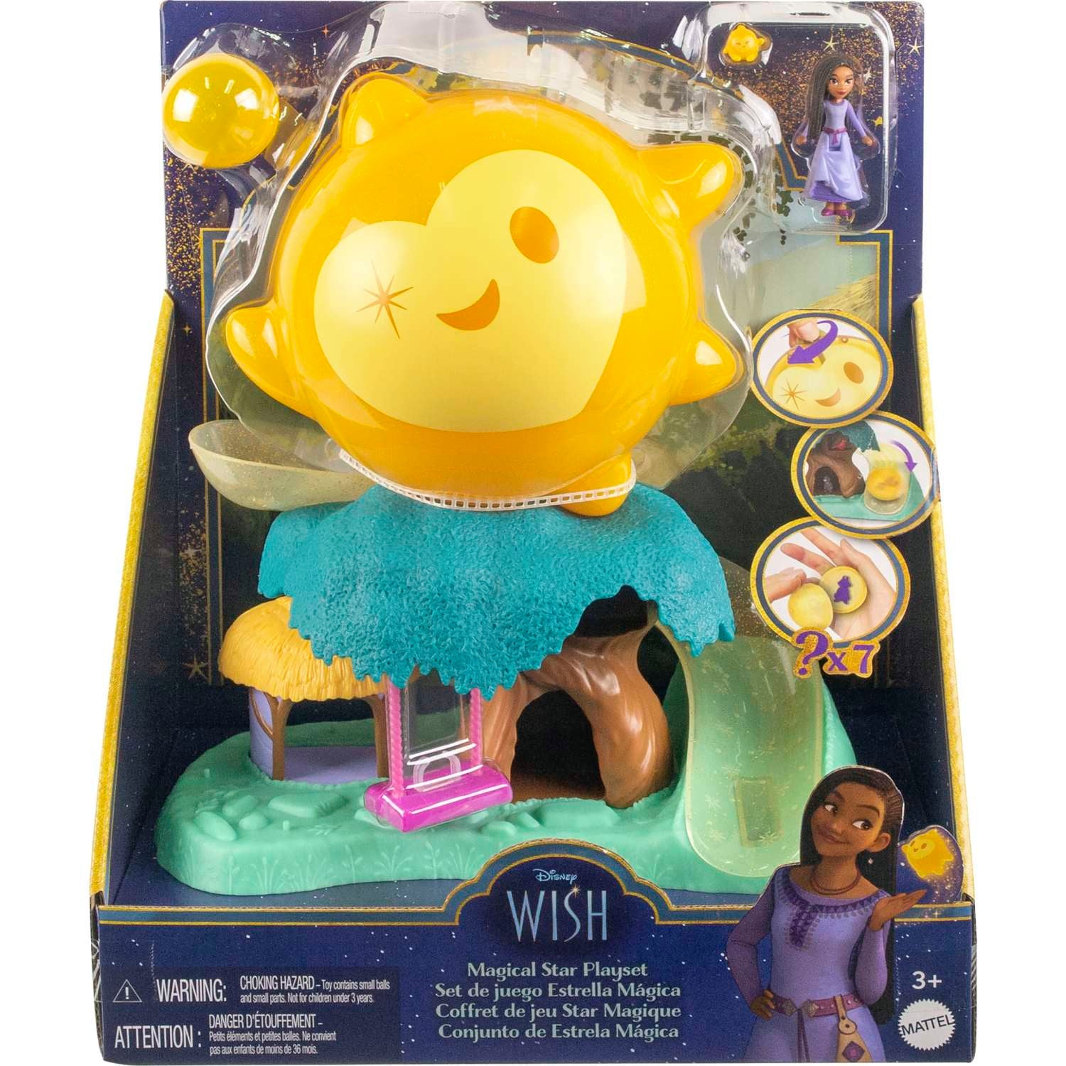 Experience the enchanting world of Disney with the Disney Wish Magical Star Playset with Asha Mini Doll & 7 Surprise Wish Orbs. This captivating playset is inspired by Disney's Wish and offers children a delightful blend of imaginative play and storytelling. Featuring the adorable Asha of Rosas mini doll, this playset allows kids to unlock the magic of wishes through interactive adventures. Children can turn the star's top to release a surprise wish orb, revealing a hidden animal friend that rolls into a whimsical woodland scene. With a treehouse, swing, and hut included, this set encourages creative storytelling. Plus, after uncovering all seven surprises, kids can insert their own wishes into the magical orb for endless fun and dreams to come true. Please note that the doll cannot stand alone, and colors and decorations may vary.