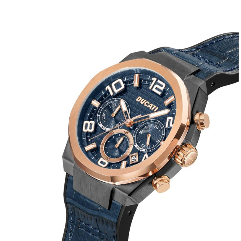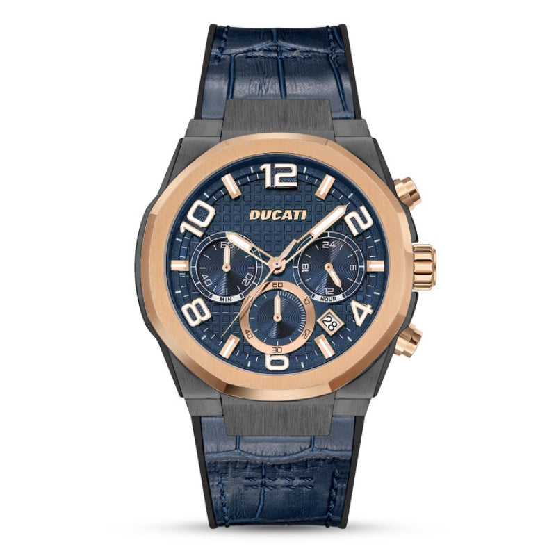 Unleash your inner champion with the Ducati Men's 43.5mm Strap Watch - Blue. This stunning chronograph watch embodies the essence of Ducati racing, featuring a rich blue dial elegantly framed by striking gold accents. Its distinctive, angular case design adds a touch of modern edge, making it the perfect accessory for those who embrace a bold lifestyle. Crafted with a genuine leather strap, this timepiece offers not only sophisticated style but also comfort for everyday wear. Whether you're at the track or in a casual setting, this watch is designed to elevate your style and keep you punctual.