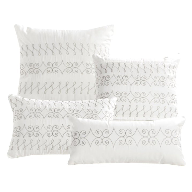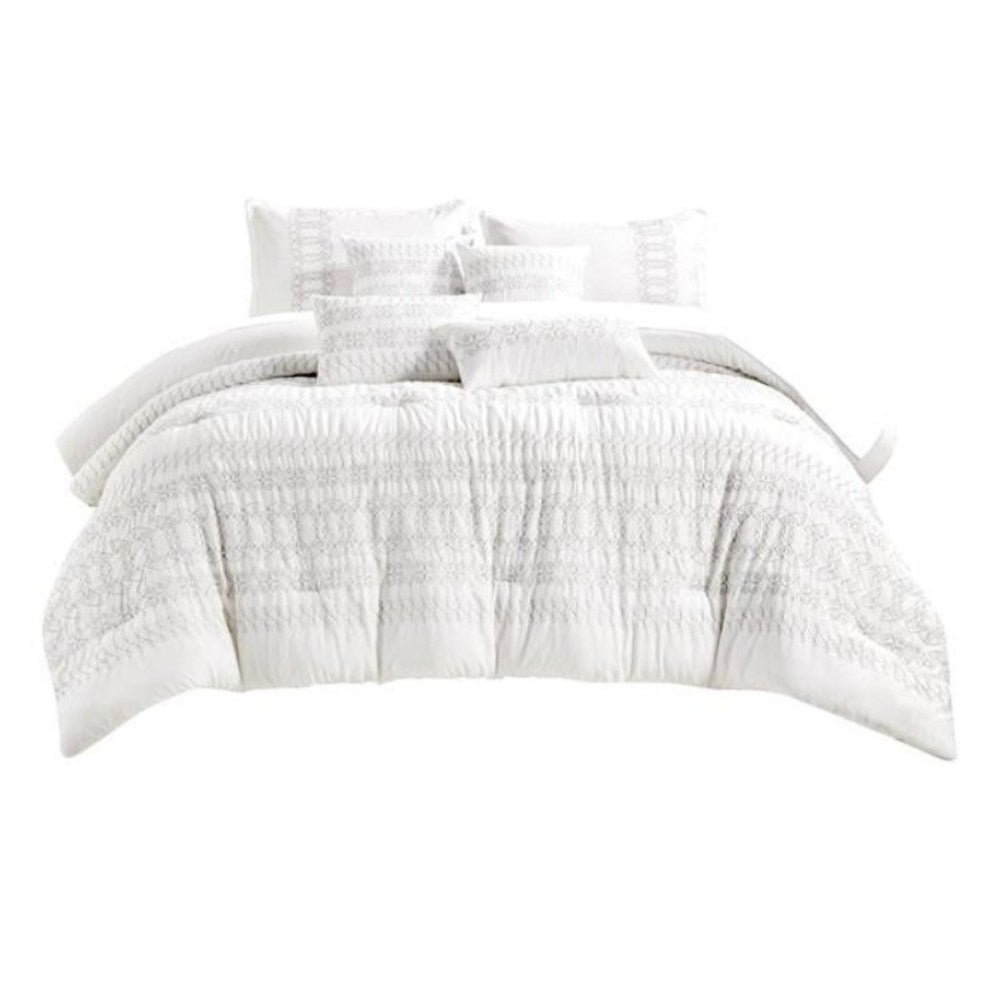 Transform your bedroom into a luxurious retreat with the ESCA Gabbatha King/California King Size Comforter Set (7-Piece) - White. This exquisite comforter set is crafted with soft microfiber fabric and features expert embroidery, providing both comfort and elegance to your sleeping space. The set includes stylish decorative pillows, adding a complete look to your bedding ensemble. Enjoy the perfect blend of functionality and style with this beautiful collection that enhances any bedroom decor while ensuring a restful night's sleep.