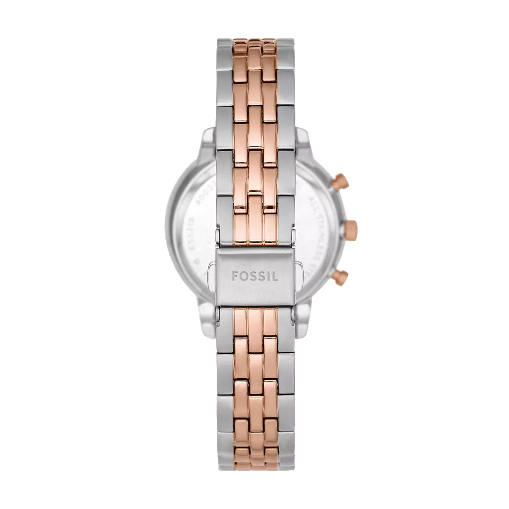 The Fossil Neutra Women's 36mm Two-Tone Bracelet Watch - White Mother Of Pearl Dial seamlessly combines elegance and functionality, making it a perfect accessory for any occasion. Featuring a stunning silver-tone case and a stainless steel bracelet adorned with rose gold-tone accents, this watch adds a sophisticated touch to both casual and formal outfits. Its minimal white mother-of-pearl dial not only enhances its aesthetic appeal but also houses advanced quartz chronograph movement, ensuring accurate timekeeping. With functionalities including 24-hour time display and a stopwatch, this timepiece is both practical and stylish, suitable for the modern woman who values both form and function.