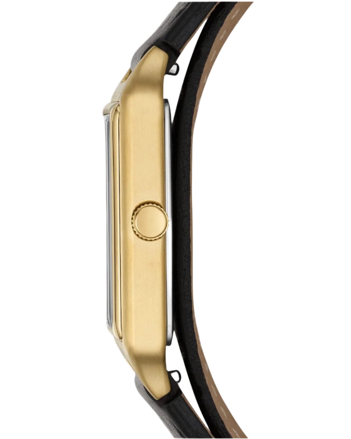 - 23mm gold-tone stainless steel case with a sleek rectangular profile
