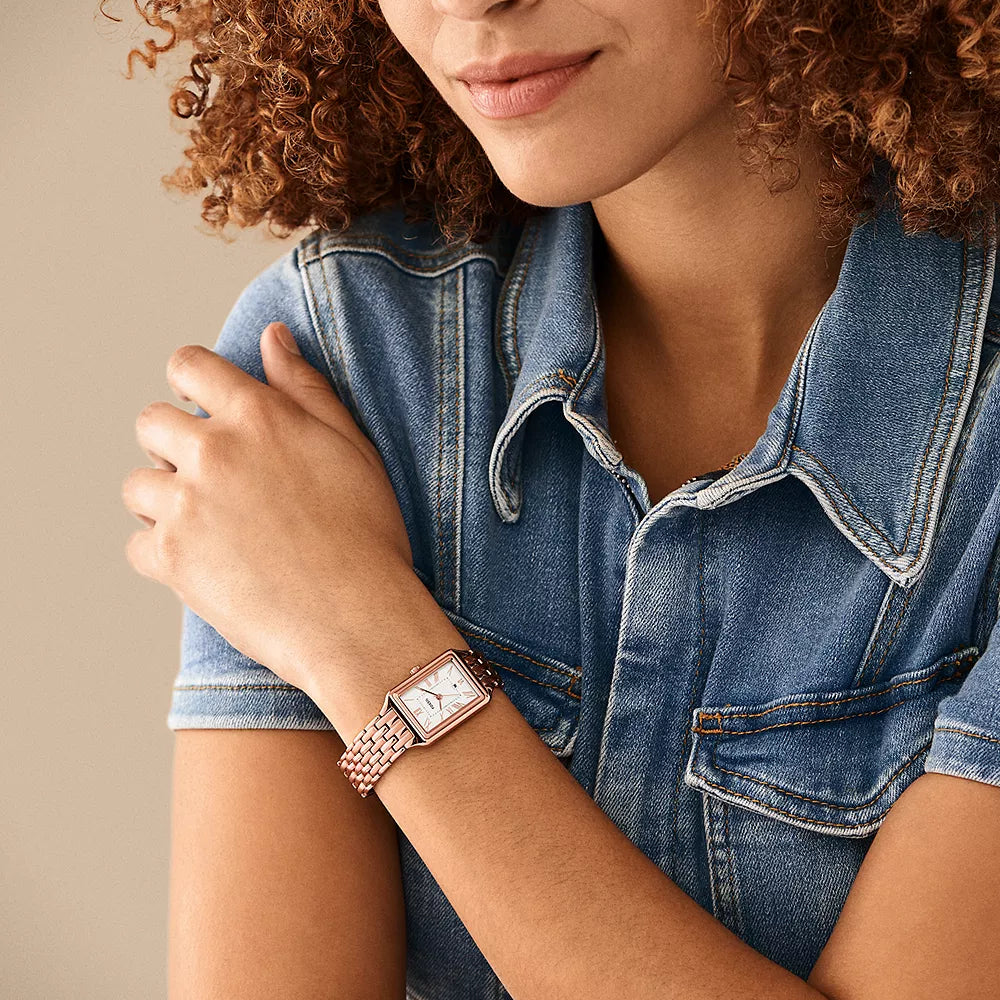 The Fossil Raquel Women's 23mm Rose Gold Bracelet Watch - White Dial combines elegance with functionality, making it the perfect accessory for any modern woman's wardrobe. Featuring a pristine white satin dial that complements the chic rose gold-tone stainless steel bracelet, this watch is designed to catch the eye while providing accurate timekeeping. The three-hand date movement adds practicality, ensuring you stay on top of your schedule without sacrificing style. Whether you're dressing up for a special occasion or adding a touch of sophistication to your everyday look, the Fossil Raquel watch stands out with its sleek design and versatile appeal.