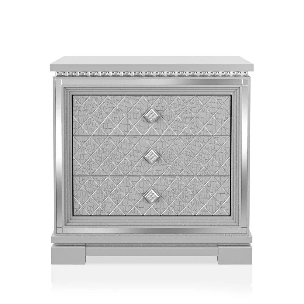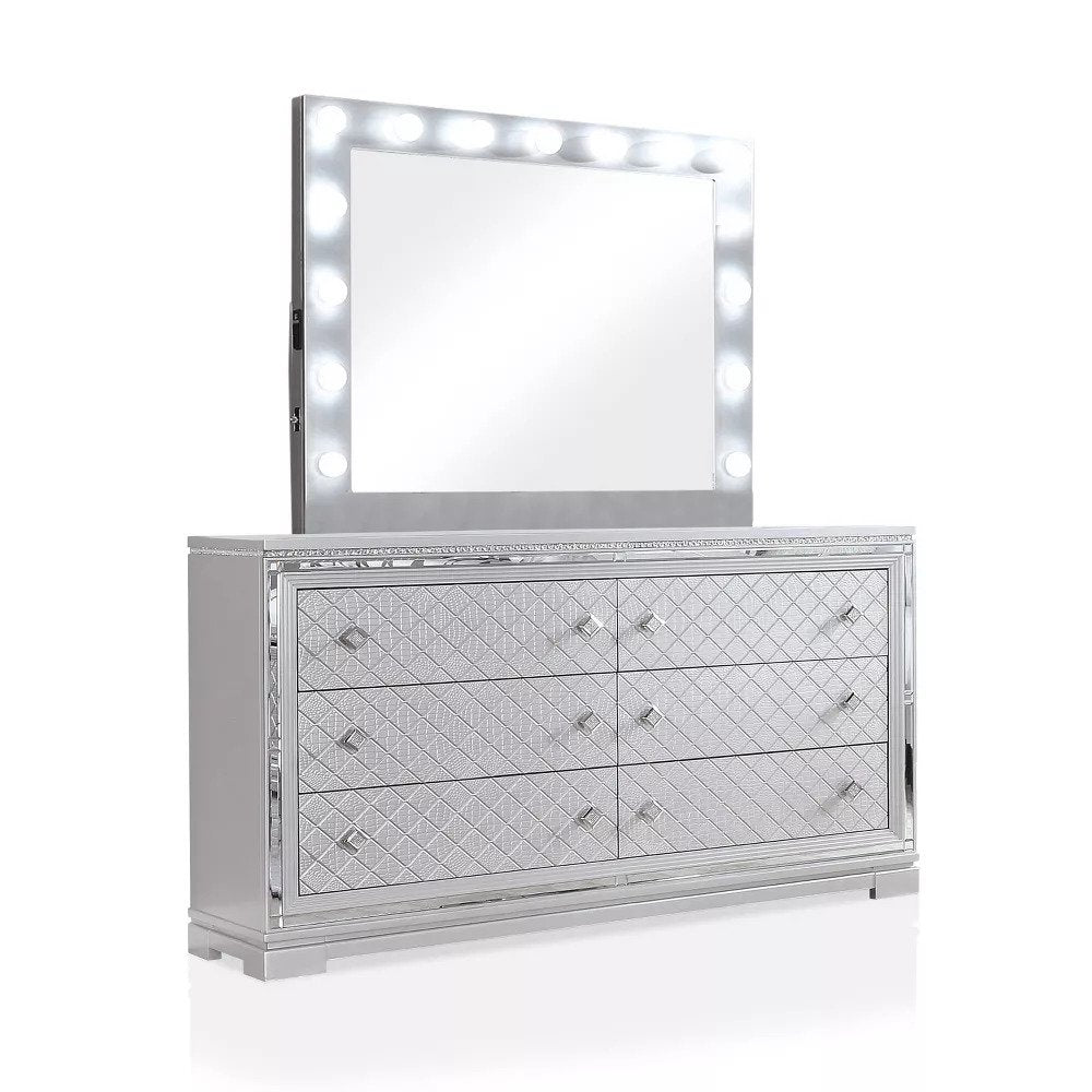 Transform your bedroom into a luxurious retreat with the Furniture Of America Belleterre Silver 4pc Bedroom Set With Queen Bed. This exceptional set exudes glamour and sophistication, making every night feel like a stay at a five-star hotel. Featuring a stunning queen bed with a button tufted headboard, this set is not just about aesthetics; it's designed for comfort and durability. The collection includes a nightstand, a spacious 6-drawer dresser, and a lighted mirror, each intricately detailed to complement the bed's elegance. With a chic silver and gray color palette accented by mirrored trim, diamond lattice designs, and sparkling faceted knobs, this bedroom set is sure to impress and elevate your home decor.