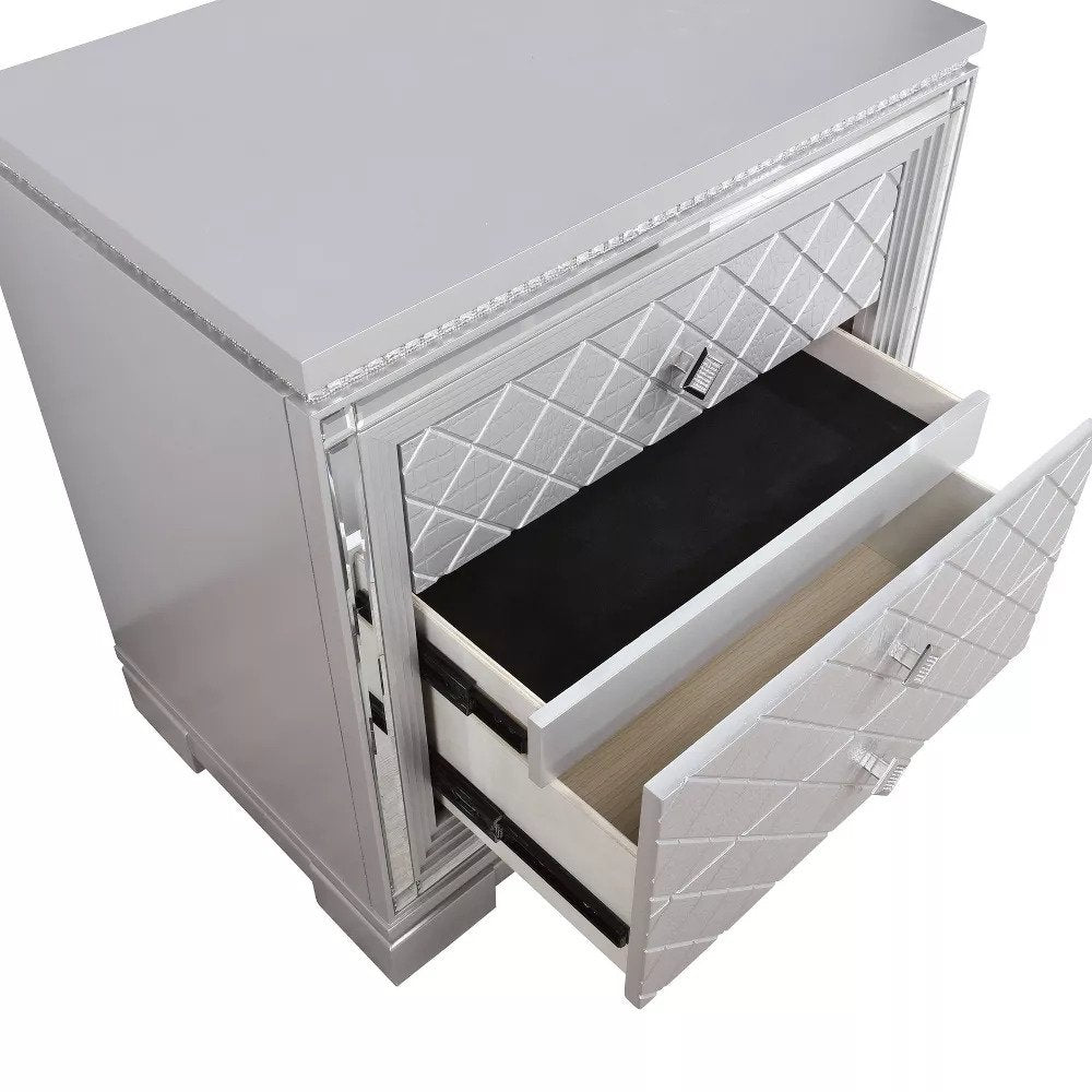 - Glamorous silver and gray finish with mirrored accents.