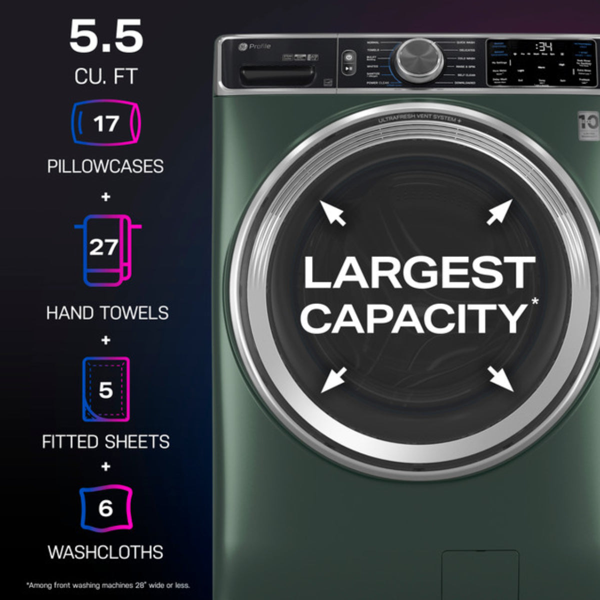 - Largest Capacity: Among front load washers that are 28" wide or less, ensuring you can wash more in one go.