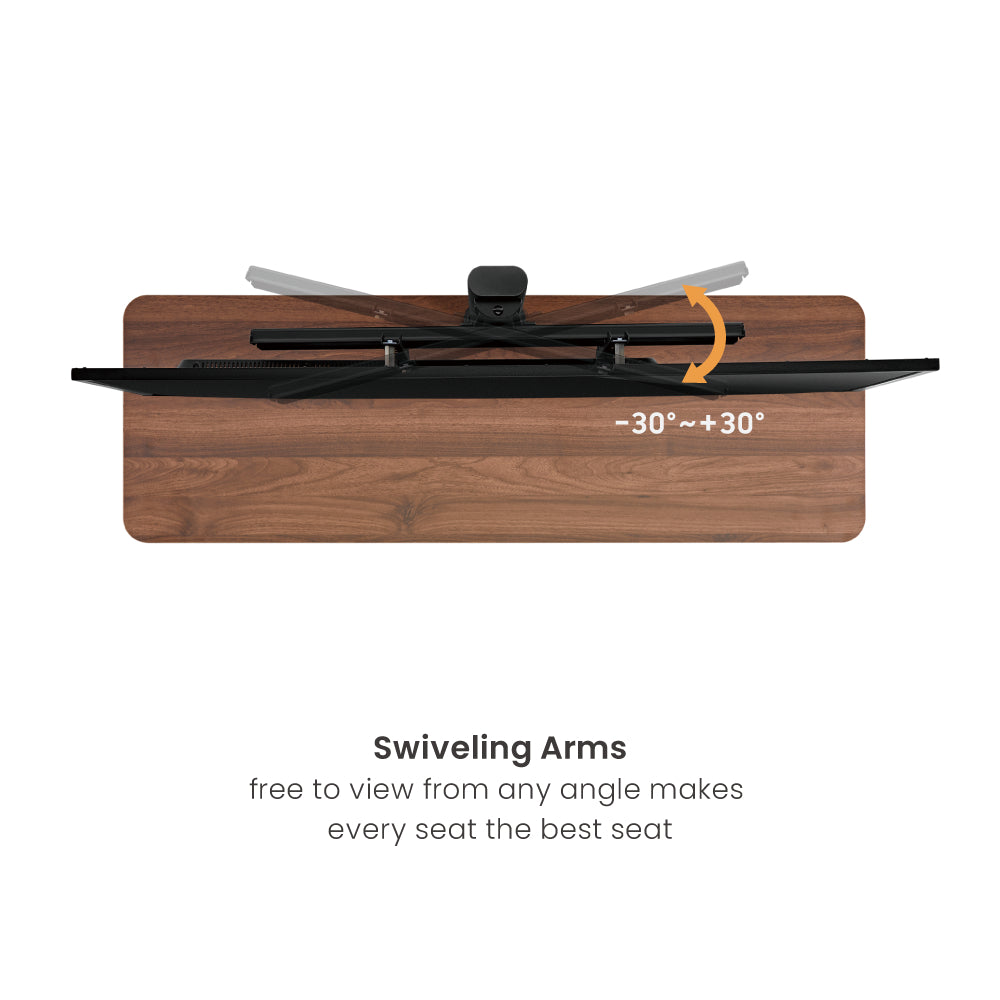 The LUMI Entertainment Center TV Stand - Black/Walnut is the perfect blend of style and functionality, designed to enhance your living space while providing ample storage for your entertainment needs. Featuring a sleek design with tempered glass shelving, this wooden TV stand offers six spacious compartments to organize your gaming consoles, DVDs, speakers, and cherished family photos. The innovative swivel bracket allows you to adjust the viewing angle, ensuring the best seat in the house no matter where you sit. With exceptional stability and durability, this TV stand not only complements your home dcor but also delivers a modern industrial aesthetic. Experience a clutter-free environment with the built-in cable clip that efficiently routes cables, making your entertainment area look neat and organized. Product Highlights Swiveling Arm(s) for maximum viewing flexibility. Six compartments for optimal storage space. Matte tempered glass middle shelves for a contemporary look. Cable clip included to reduce clutter. Sturdy construction ensuring stability and longevity.