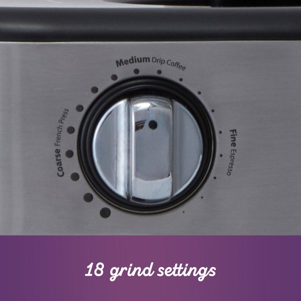 True coffee lovers know that freshly ground coffee beans always make the best-tasting coffee. The Mr. Coffee 2141813 18-Cup Cafe Grind Automatic Burr Grinder - Stainless Steel/Black is designed to do just that"”with one simple touch. The Cafe Grind coffee grinder easily grinds whole coffee beans to yield consistent, flavorful coffee grounds for making regular coffee, espresso, cappuccinos, lattes, mochas, and all your other favorite coffee beverages. Burr grinders are considered to be the best method for grinding whole coffee beans, as they use flat, precise plates rather than blades to grind the beans more uniformly. This burr grinder features 18 cup settings and 18 grind settings. Depending on the grind setting you select, the machine can make several consistencies, ranging from coarse to fine, that allow you to prepare coffee in a drip machine, espresso maker, French press, pour-over, and more. Once grinding is complete, the burr coffee grinder shuts off automatically for greater safety. The included bean hopper holds up to a 1/2 lb. of coffee beans, and like the grinding chamber, removes them for easy cleaning. With its elegant stainless steel finish, this coffee-grinding machine integrates easily into any decor. Product Highlights 18 cup settings for brewing up to 18 cups of coffee at once. 18 grind settings for customized grind consistency. Automatic shut-off feature for enhanced safety. Large bean hopper holds up to 1/2 lb. of coffee beans. Elegant stainless steel/black finish complements any kitchen decor.