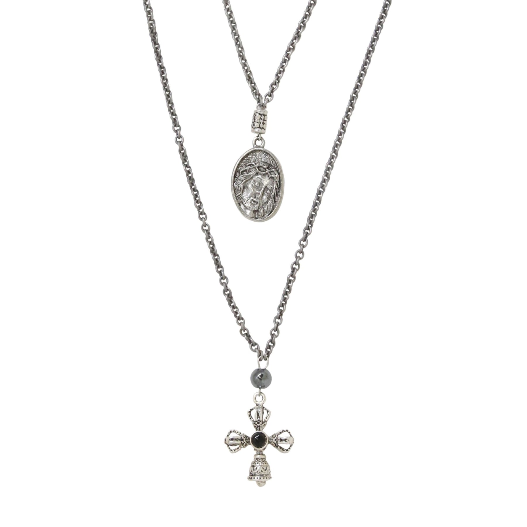 - Stylish layered design with cross and coin pendants
