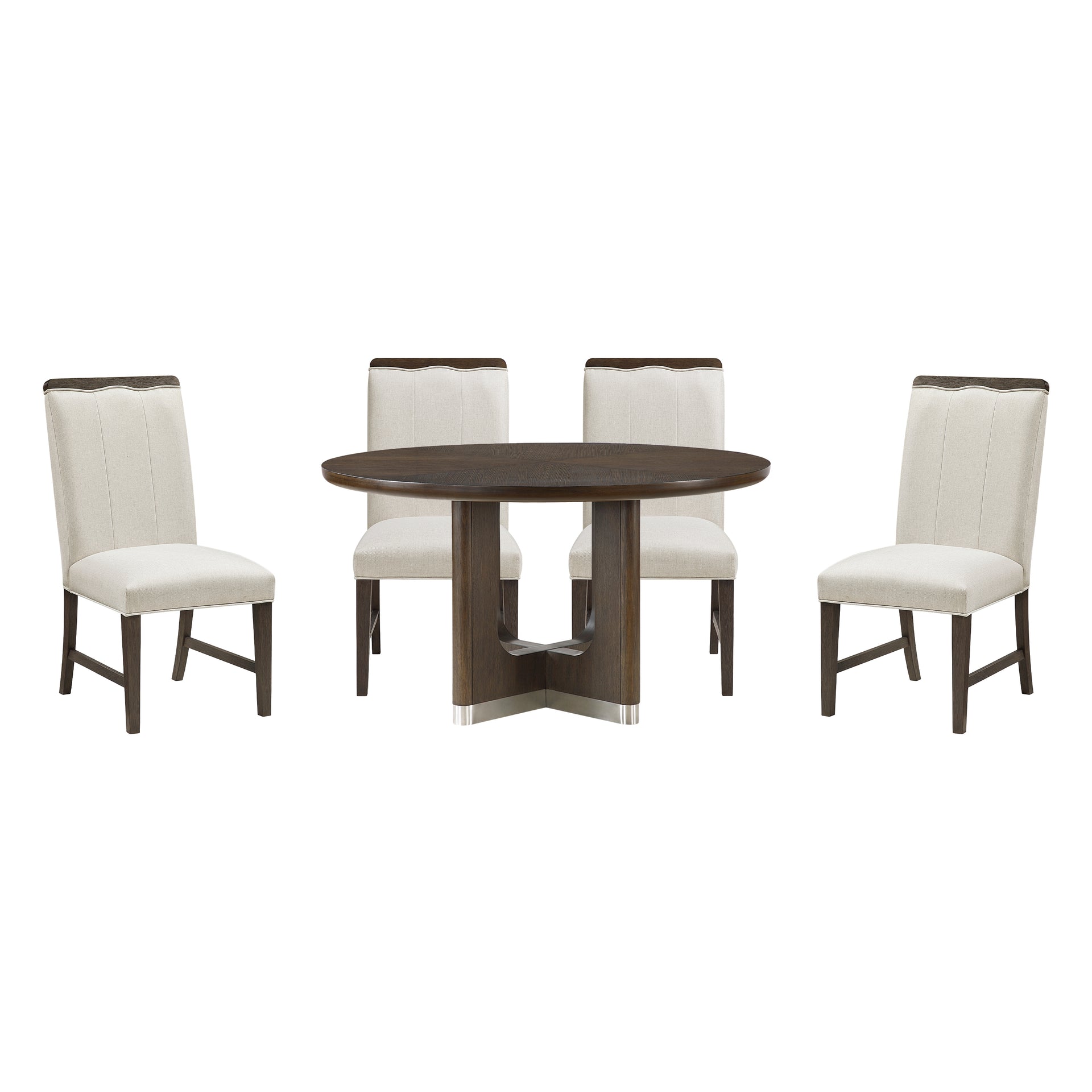 Enhance your dining area with the Nobel 5PCS Round Dining Set by Homelegance, featuring a refined wire-brushed brown finish. The elegant round table, with its durable oak veneer top and distinctive metallic-accented base, comfortably accommodates four. Complementing the table are textured fabric-upholstered chairs built on sturdy plywood frames for lasting comfort. This collection blends strong craftsmanship with stylish design to create a welcoming and functional dining experience.