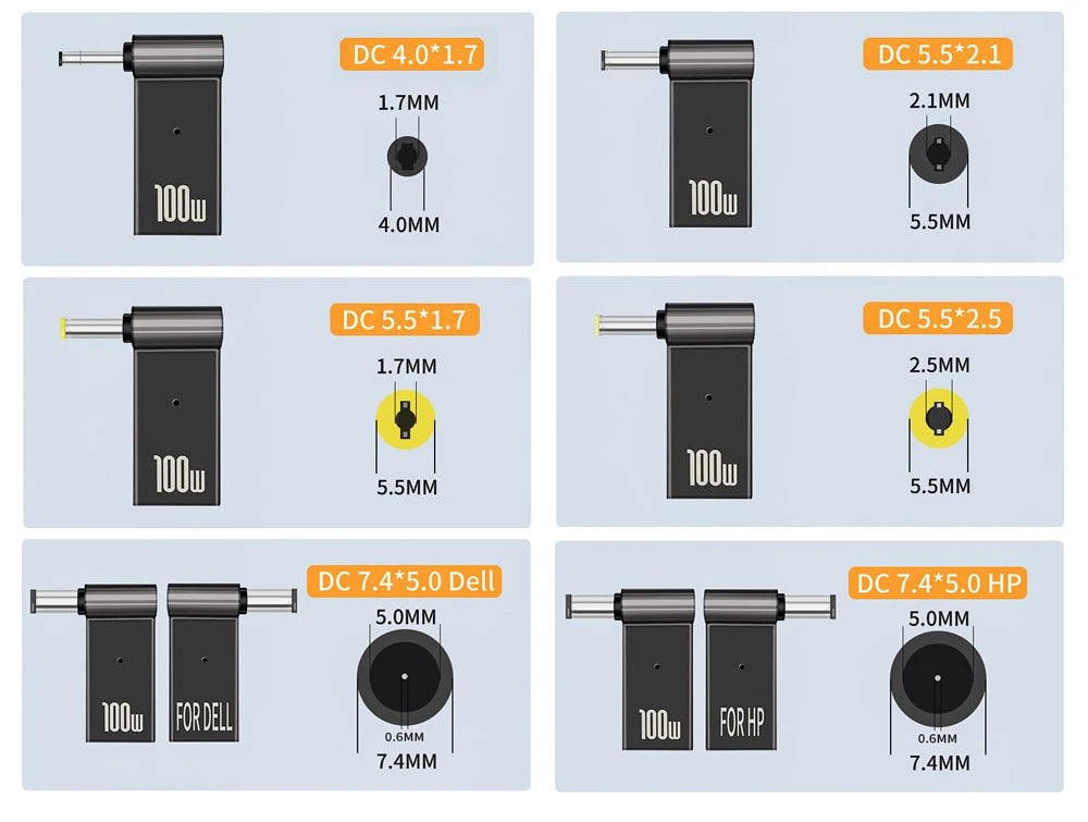 PD 100W Laptop Power Charger Adapter 5A 20V Type-C to DC Plug for Lenovo HP DELL