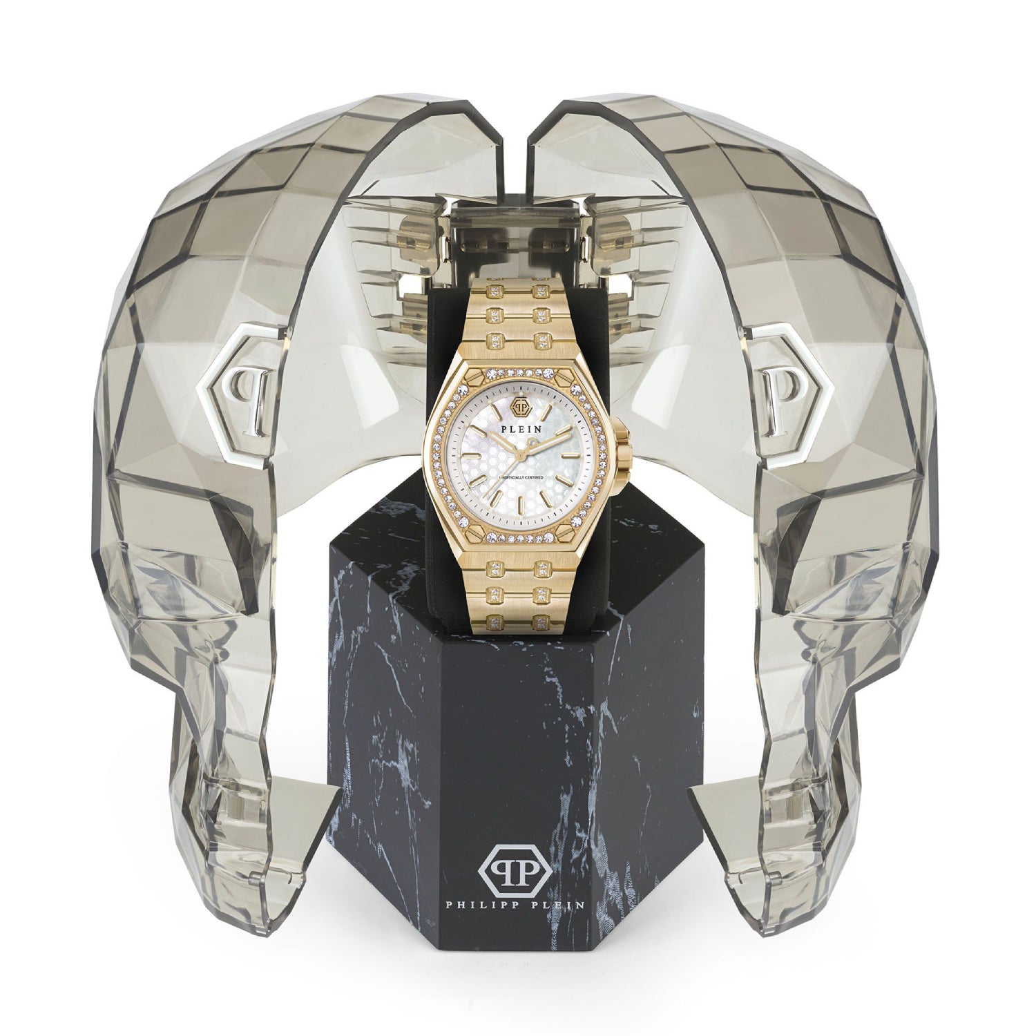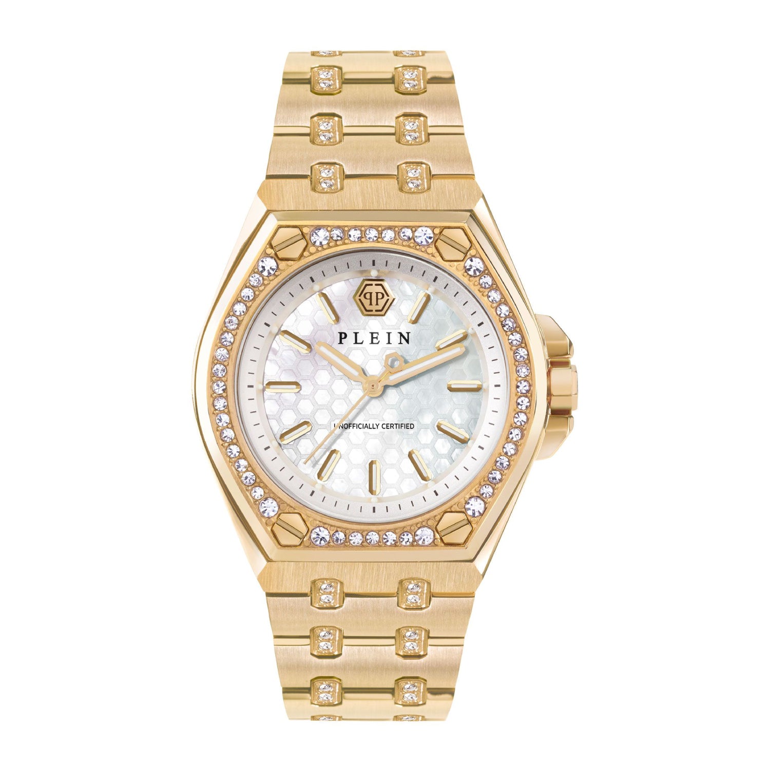 Elevate your accessory game with the Philipp Plein Extreme Crystal Women's 38mm Three-Hand Yellow Gold Bracelet Watch - White Dial. This stunning timepiece merges high-fashion aesthetics with functional design, making it an ideal addition to your collection of women's watches. Designed with 96 clear round Preciosa crystals, this watch adds a touch of dazzle and glamour to your everyday style. The 38mm ion-plated yellow gold stainless steel case and bracelet ensure that this watch is not only beautiful but also durable, boasting a water resistance of up to 5 ATM. With its precise 3-hand quartz movement, easy-to-read silver-tone honeycomb-pattern dial adorned with gold-tone accents, and luminous features, this watch is perfect for both day and night wear.