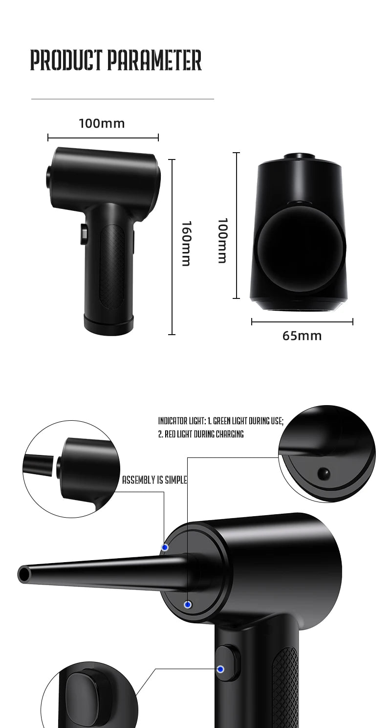 Introducing the Portable Air Duster for Computer Cleaning, your ultimate solution for keeping your devices spotless and dust-free. With a powerful rotating speed of 51000 RPM, this cordless compressed air blower makes cleaning fast, efficient, and effortless. Perfect for tackling stubborn dust and crumbs from your computer, keyboard, and even your car interiors, it ensures a pristine environment for your electronics and living spaces. The built-in LED light illuminates hidden corners, allowing you to reach every nook and cranny with precision.