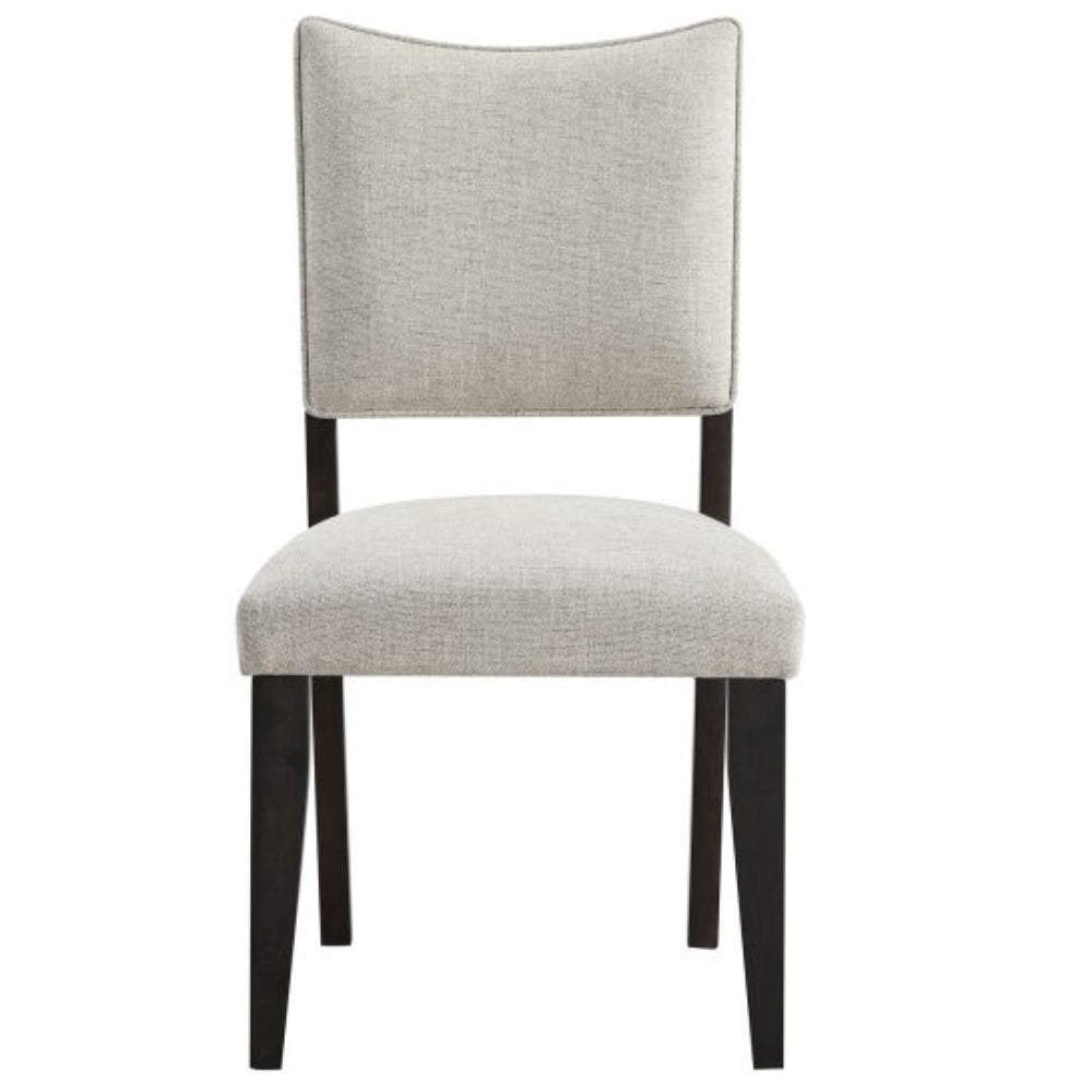 Smartly tailored and crisply upholstered, the Roatan Side Chair elevates your dining experience. This contemporary chair features an oatmeal-colored, herringbone-patterned polyester cover, providing a subtle yet sophisticated pattern. The fabric beautifully complements the sleek black wood stain, making it a versatile addition to any room. Unmatched comfort is yours with a welted back and a generously padded 5-inch cushioned seat, ensuring a plush seating experience whether dining, working in the office, or relaxing in the living room. The wood-rimmed back enhances the chair’s aesthetic when tucked under the table and ensures durability by reducing wear and tear.