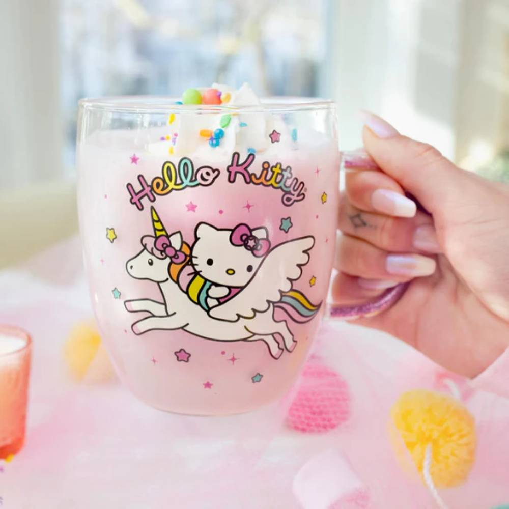 Sanrio Hello Kitty Unicorn 14 oz Glass Mug With Glitter Handle - White/Pink