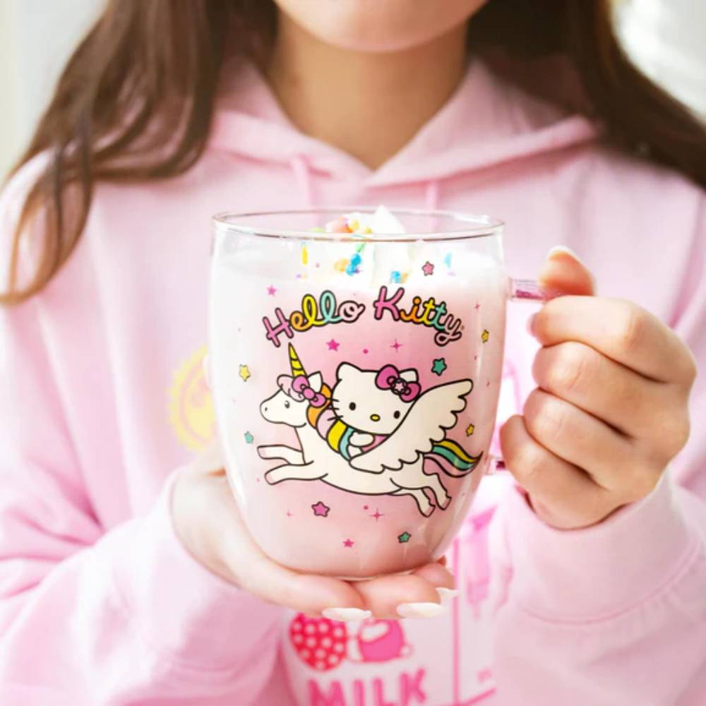 Elevate your morning routine with the Sanrio Hello Kitty Unicorn 14 oz Glass Mug With Glitter Handle - White/Pink. This charming mug combines functionality with a sprinkle of kawaii flair, making it the ultimate choice for Hello Kitty fans. Featuring the beloved Sanrio character front and center on a dazzling unicorn, this glass mug is perfect for sipping your favorite beverages, whether it's a hot cup of coffee or a refreshing iced tea. Its captivating design, adorned with vibrant colors and a shimmering pink glitter handle, promises to brighten up your day and add a delightful touch to your tableware collection. Designed for those who appreciate cuteness and quality, this mug is ideal for entertaining guests or enjoying a personal moment of joy. Product Highlights: Exclusive Sanrio design featuring Hello Kitty riding a unicorn. Vibrant colors with a glittery pink handle for a touch of sparkle. Generous 14 oz capacity to hold all your favorite beverages. Durable glass construction, perfect for any occasion. Hand-wash only, ensuring the mug retains its charm and vibrancy.