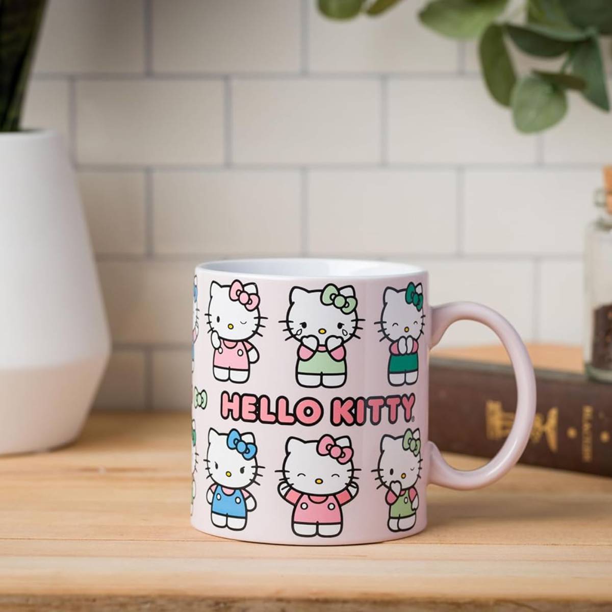 Enjoy your favorite beverage in style with the Sanrio Hello Kitty Various Emotions and Poses 20 oz Ceramic Mug - Multicolor! This fun and functional ceramic mug is perfect for home, office, parties, and more. Featuring an adorable toss print of Hello Kitty showcasing her many poses, emotions, and colorful outfits, this mug adds a playful touch to your daily routine. Holding a generous 20 oz, it's ideal for your morning coffee or tea, and also serves as a charming collector's item for storing loose change, pens, or other small items. With its BPA-free composition, this mug is microwave-safe and can be easily cleaned in the dishwasher's top rack, making it an excellent choice for everyday use!