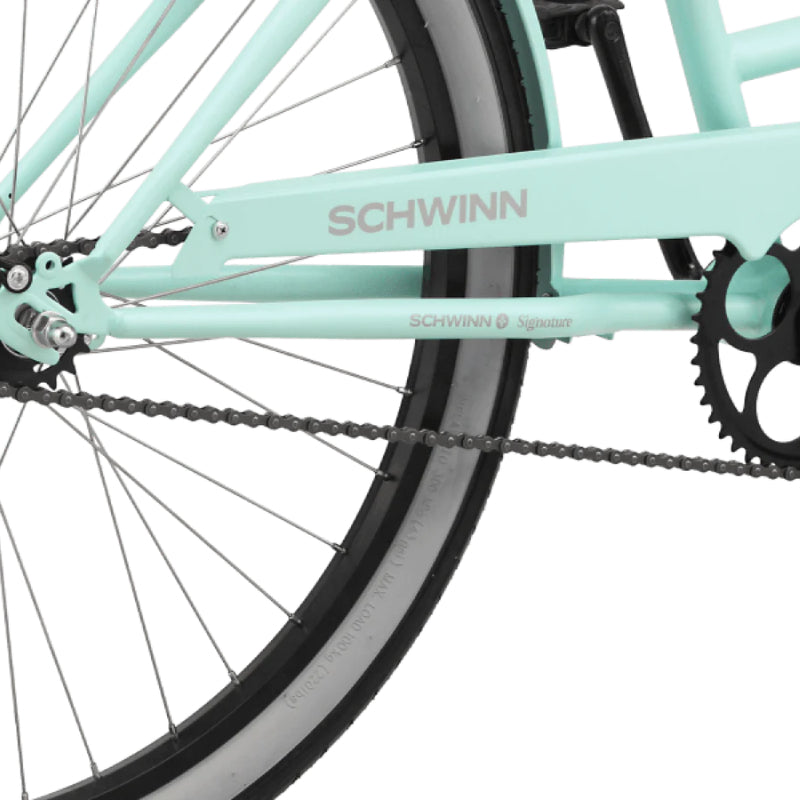 The SCHWINN 26" Largo 1 Step-Thru Bike - Mint is the ideal companion for anyone looking to enjoy a comfortable, stylish ride without sacrificing functionality. Its elegant step-thru frame design not only enhances accessibility but also provides a relaxed riding posture, perfect for all ages. With a single-speed drivetrain, this bike simplifies your riding experience, allowing you to focus on the journey rather than gear shifting. The reliable coaster brake ensures safe stops, making it a low-maintenance option for everyday use. Whether you're commuting through the city or taking a leisurely ride in the park, the Largo promises a smooth and enjoyable experience, infused with a touch of vintage charm.