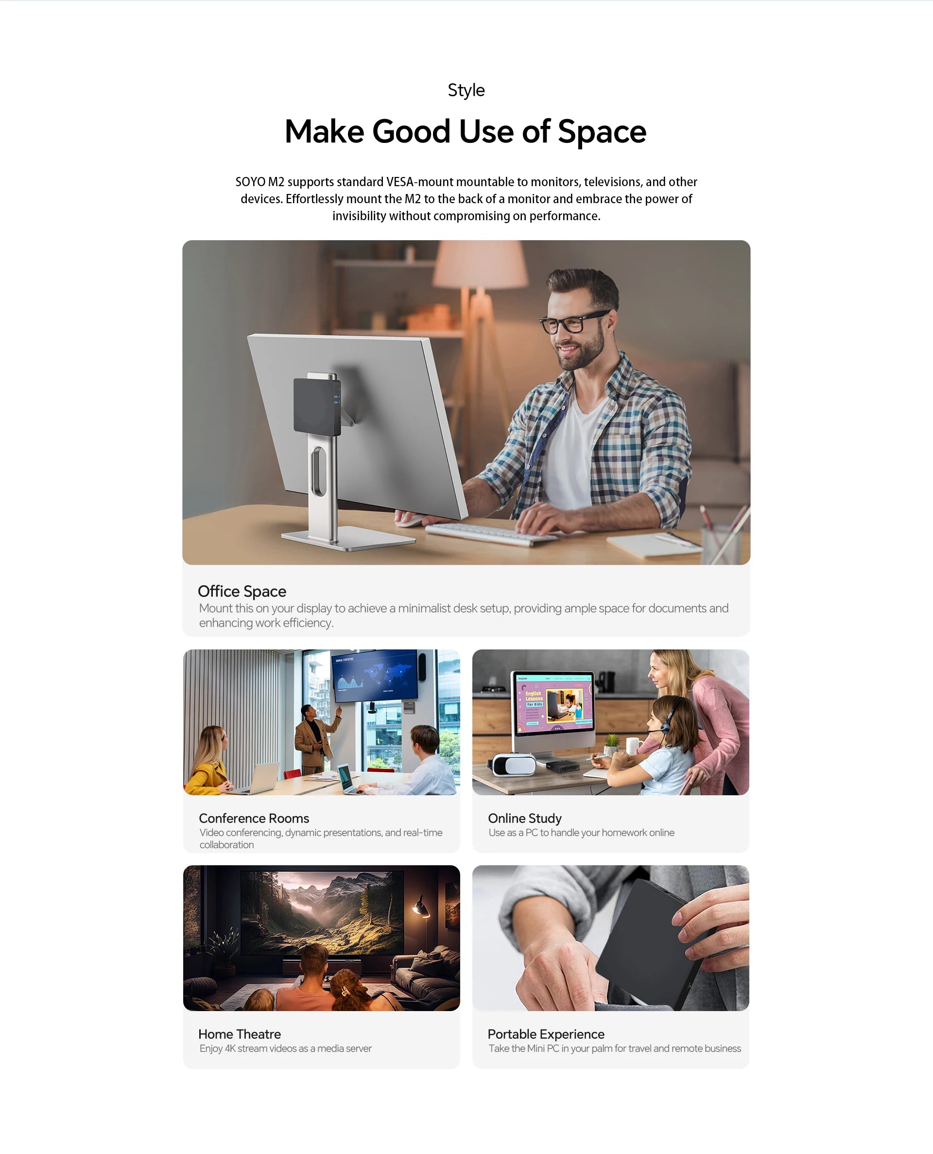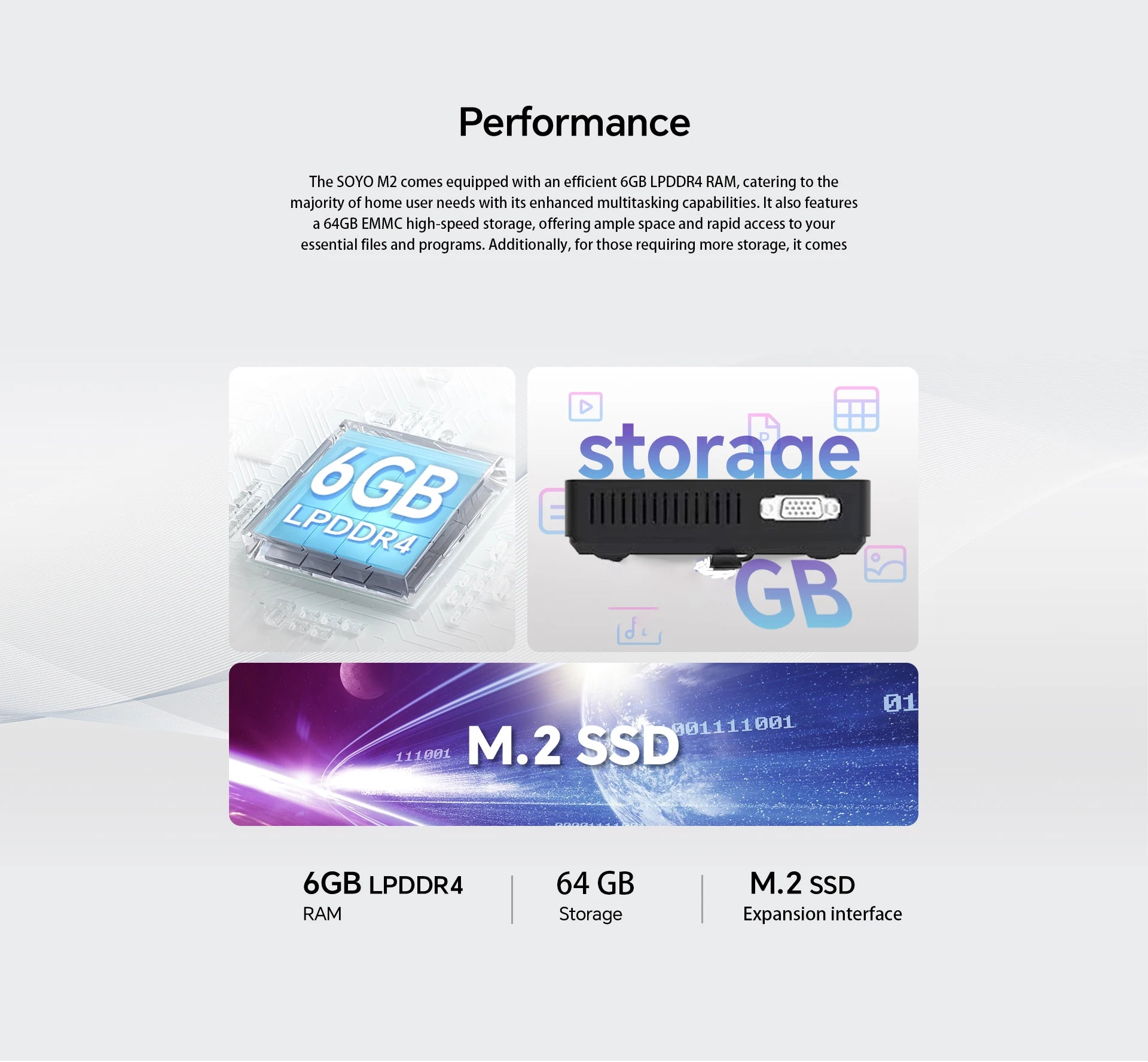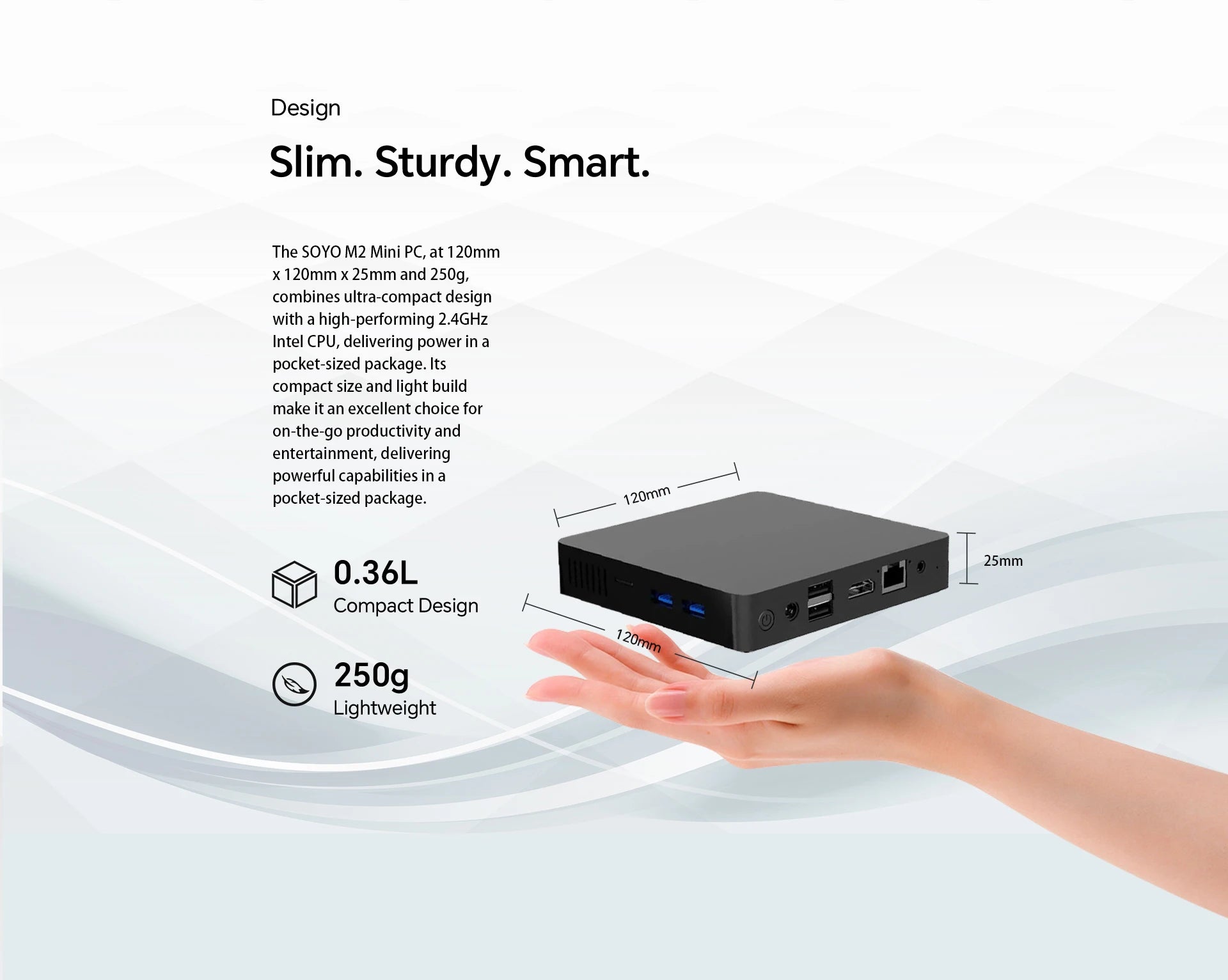 The SOYO M2 Mini PC is a powerful and compact computing solution, engineered to meet the demands of both home and business environments. Featuring an impressive 6GB of RAM and 64GB of EMMC storage, this mini PC offers seamless multitasking capabilities, making it perfect for productivity, casual browsing, and light gaming. Powered by the reliable Intel N3350 processor, you can expect smooth performance and an enhanced user experience. With the user-friendly Windows 10 operating system pre-installed, integration with other devices and applications is effortless, providing versatility that suits any setting. Whether you need a workstation, a home entertainment hub, or a portable computing option, the SOYO M2 Mini PC is your ideal choice.