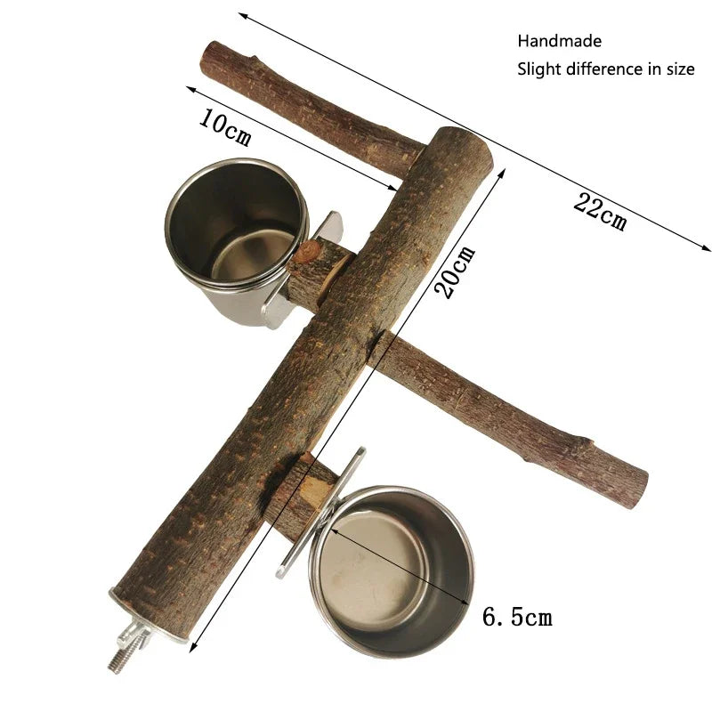 1Set Stainless Steel Birds Parrot Feeder Bowl Round Small Pet Natural Wood Stand Food Water Drinking Feeding Bowl